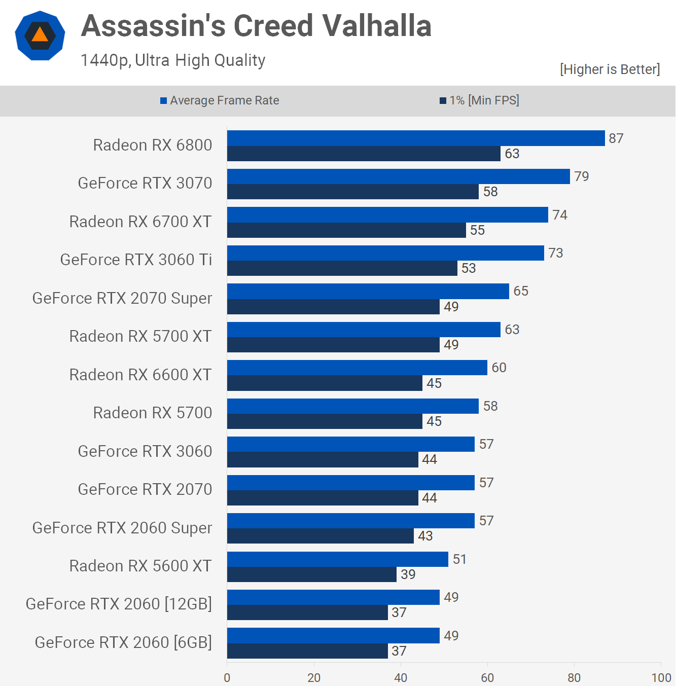Starting with Assassin's Creed Valhalla at 1080p and please note these results have been updated with the latest version of the game which greatly enhanced the performance of high-end GeForce GPUs, with more mild gains for the mid-range or lower-end models, like the RTX 2060.