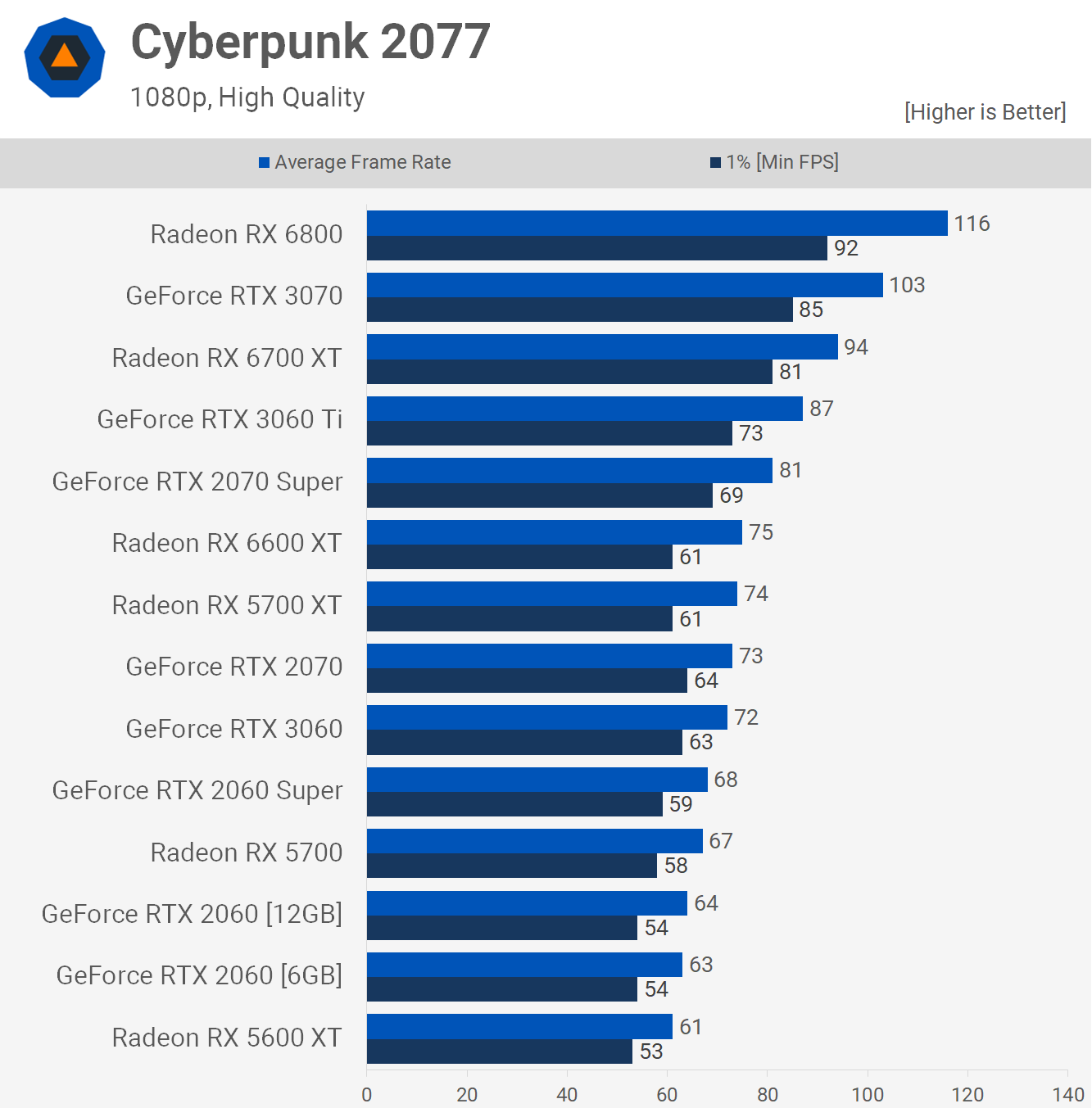 The situation at 1440p is no different with both 2060 models averaging just 49 fps, making them slower than the 5600 XT.