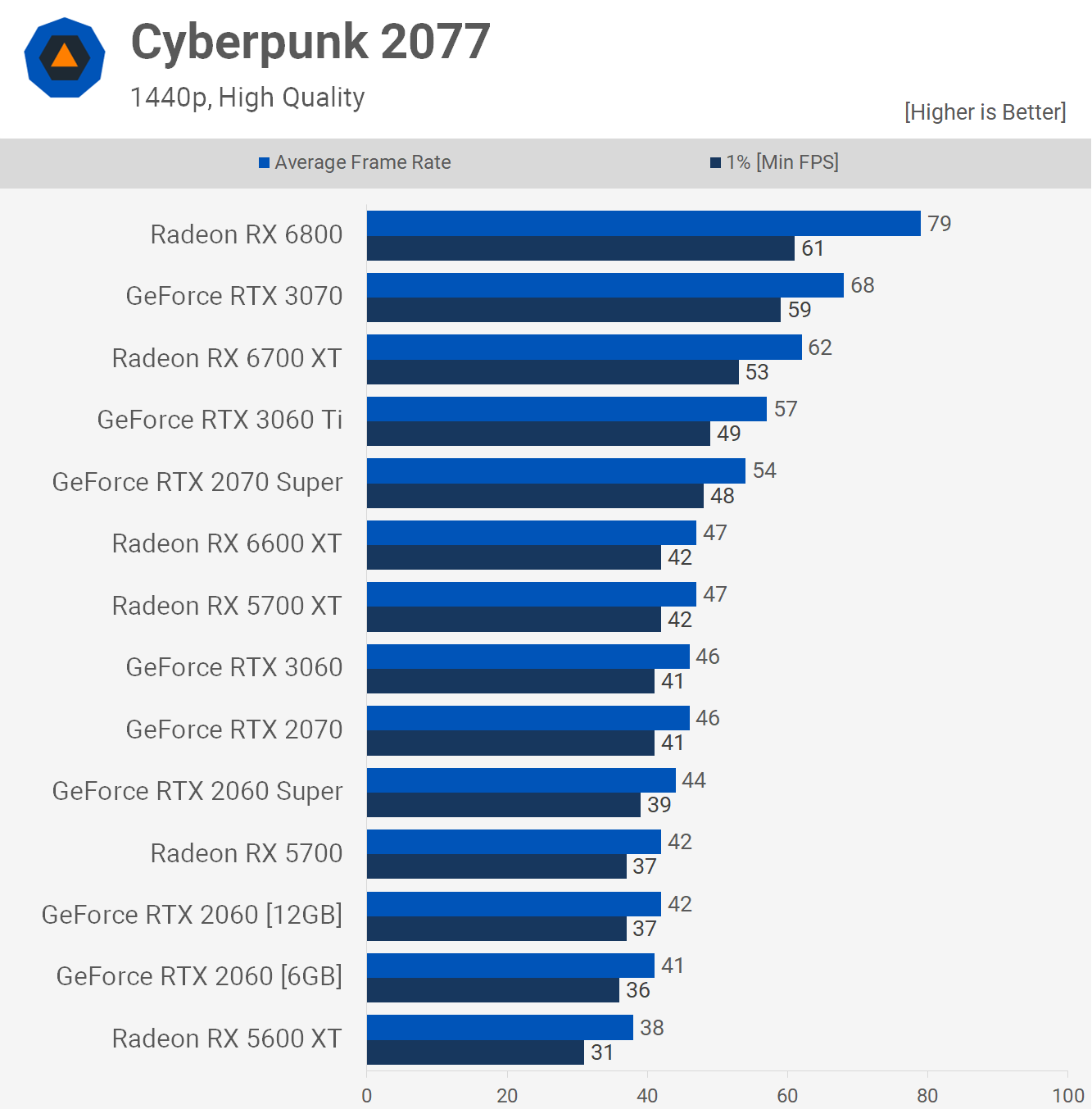 Next we have Cyberpunk 2077 and we're looking at very similar performance to the 6GB model. Actually at this point you can call what we're seeing at 1080p 'identical performance', with 64 fps on average using slightly dialed down quality settings.