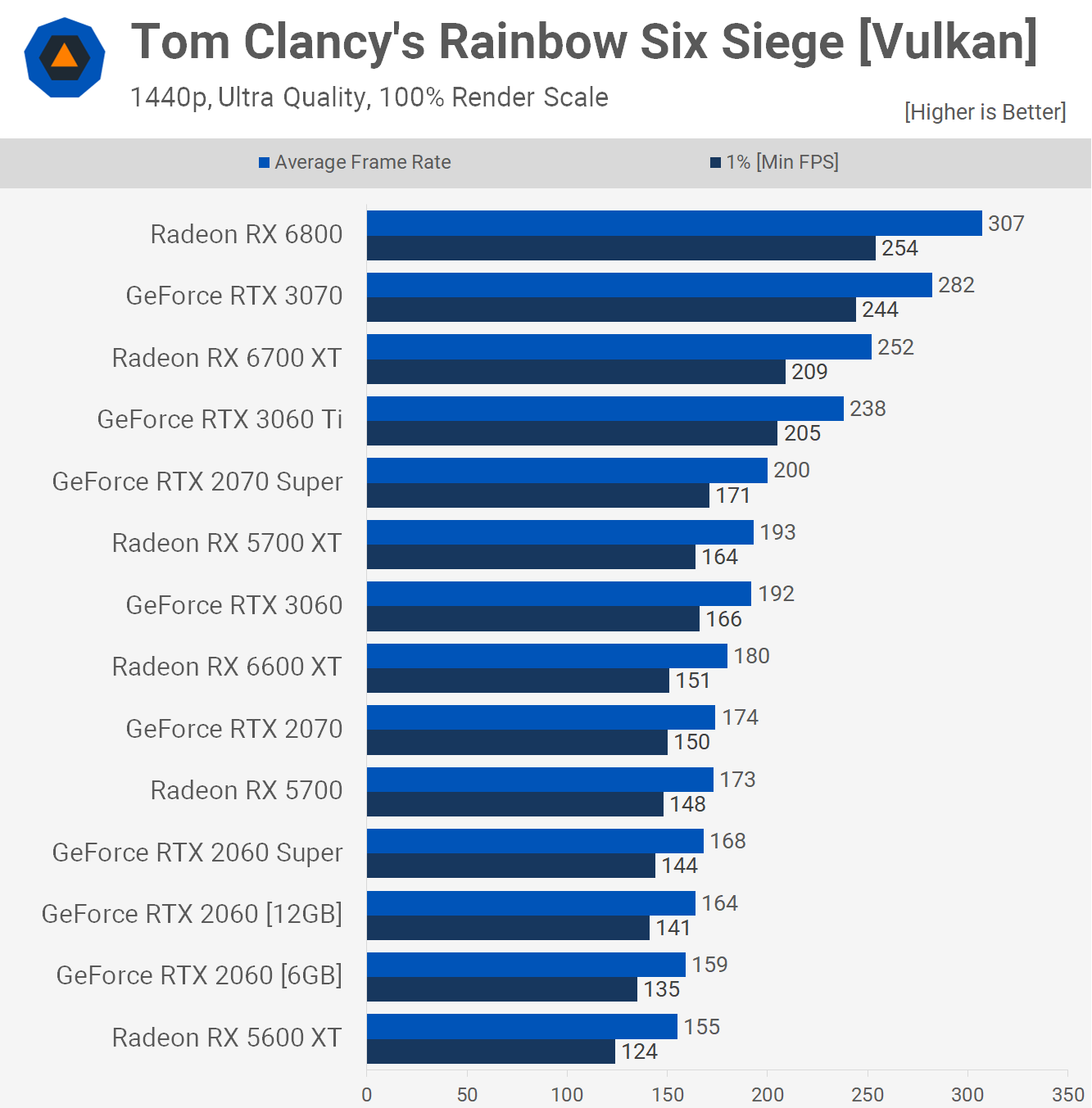We're looking at up to a 5% boost in Rainbow Six Siege at 1080p, which is about as good as it gets for the 12GB 2060 over the 6GB board.