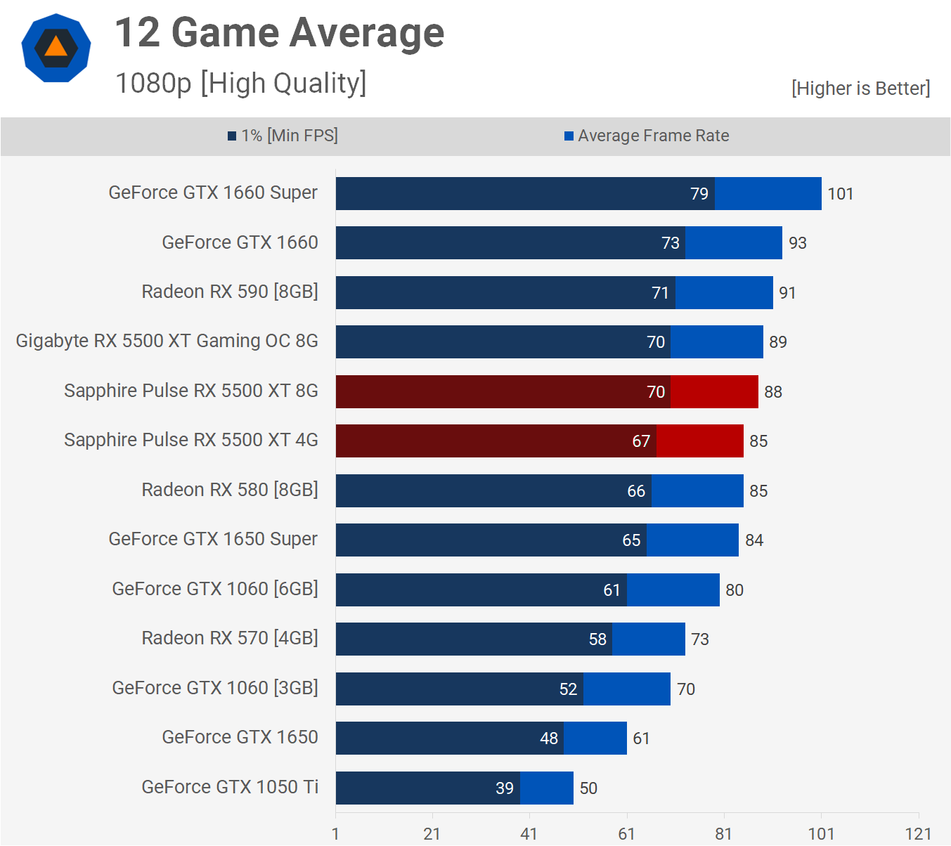 However, the story changes at 1440p where the 4GB 5500 XT struggles and the average frame rate drops by 11%. This means the 5500 XT was now only able to match the 1650 Super and RX 570.