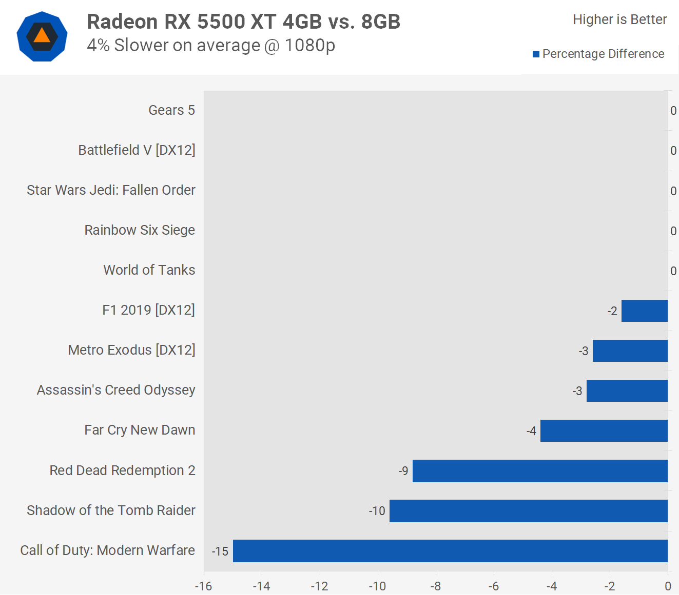 Wrapping things up we have a few RX 5500 XT 4GB vs. 8GB graphs that show the margins on a per game basis. Here you can see that the 4GB model struggled in Call of Duty Modern Warfare, Shadow of the Tomb Raider and Red Dead Redemption 2, while we saw small performance drop offs in Far Cry New Dawn, Assassin's Creed Odyssey and Metro Exodus, though they were so small in those titles it's really not worth talking about.