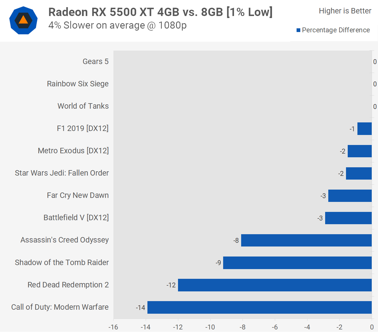 If we look at 1% low performance we see similar margins for the most part, though the 4GB version had a harder time in Assassin's Creed Odyssey.