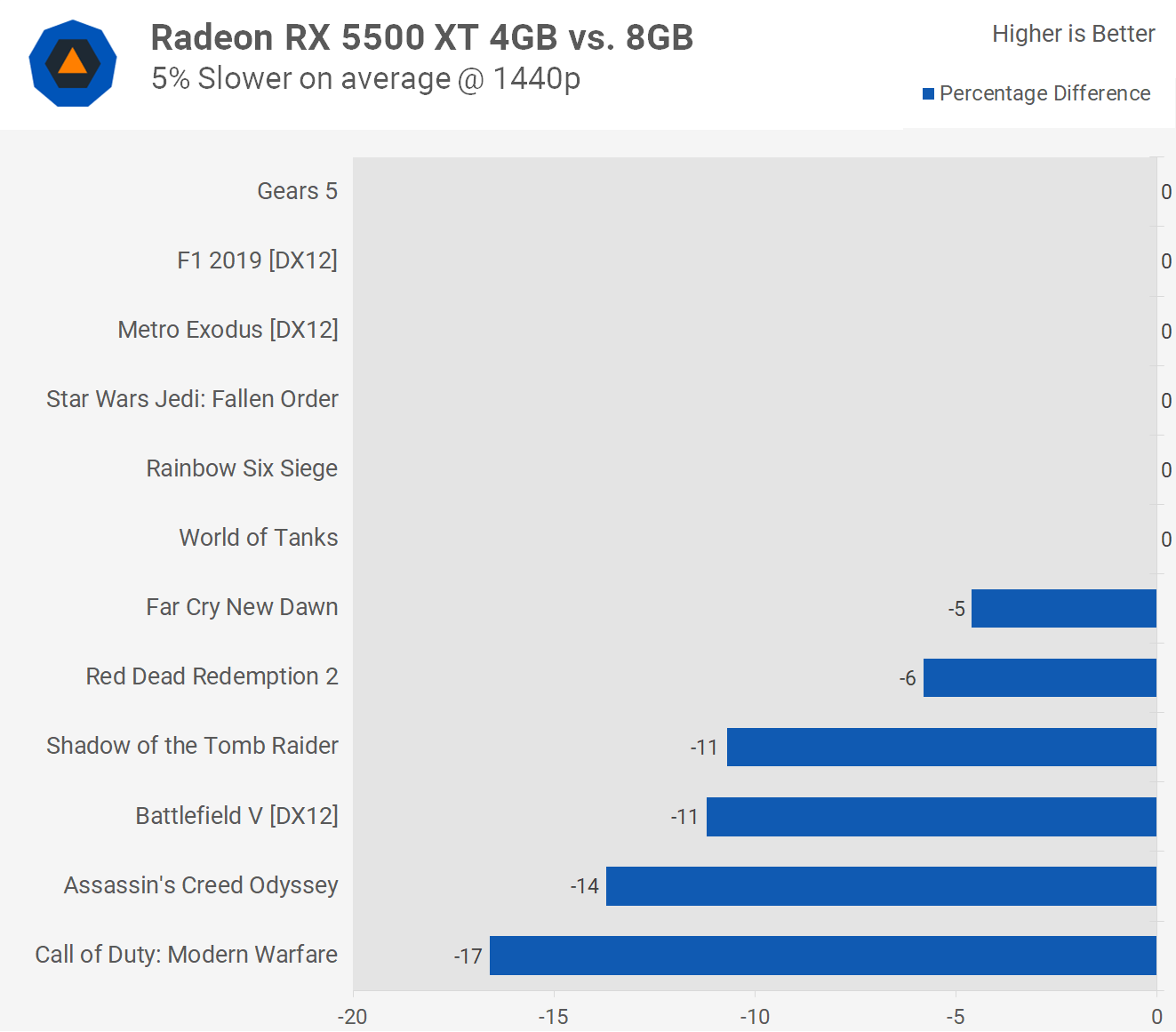 Although the 4GB 5500 XT also takes a hit at 1440p, we think the biggest performance bottleneck here are the GPUs themselves, so in other words the GPUs are choking before VRAM capacity becomes a serious issue.