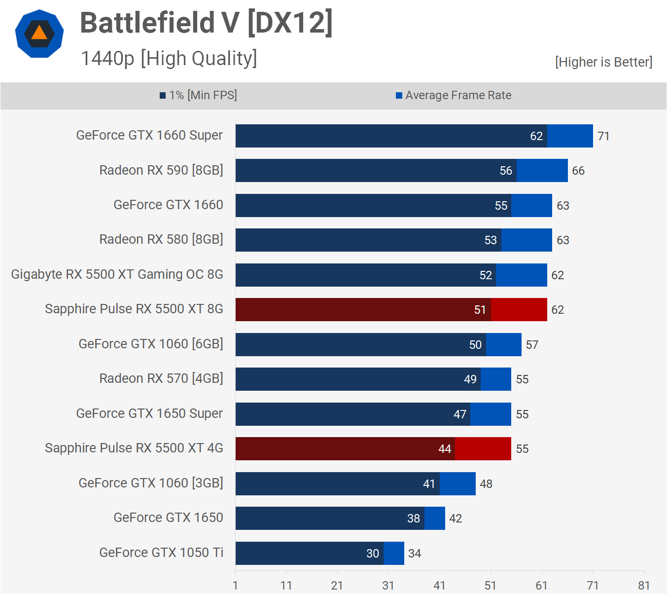 However things get worse for the RX 5500 if we look at a single title like Battlefield V. We're using the 1440p data here because it represents a situation where the 4GB VRAM capacity starts to impact performance considerably, something you'll no doubt see more of in the next year or two.
