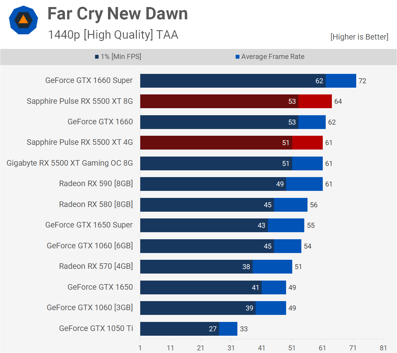 The 4GB 5500 XT drops a few frames when compared to the 8GB model in Far Cry New Dawn, but overall performance at 1080p using the second highest quality preset is still very good.