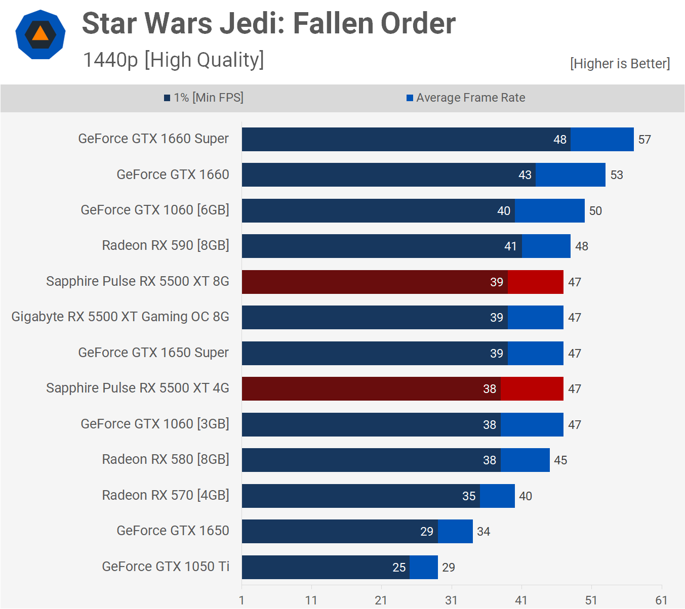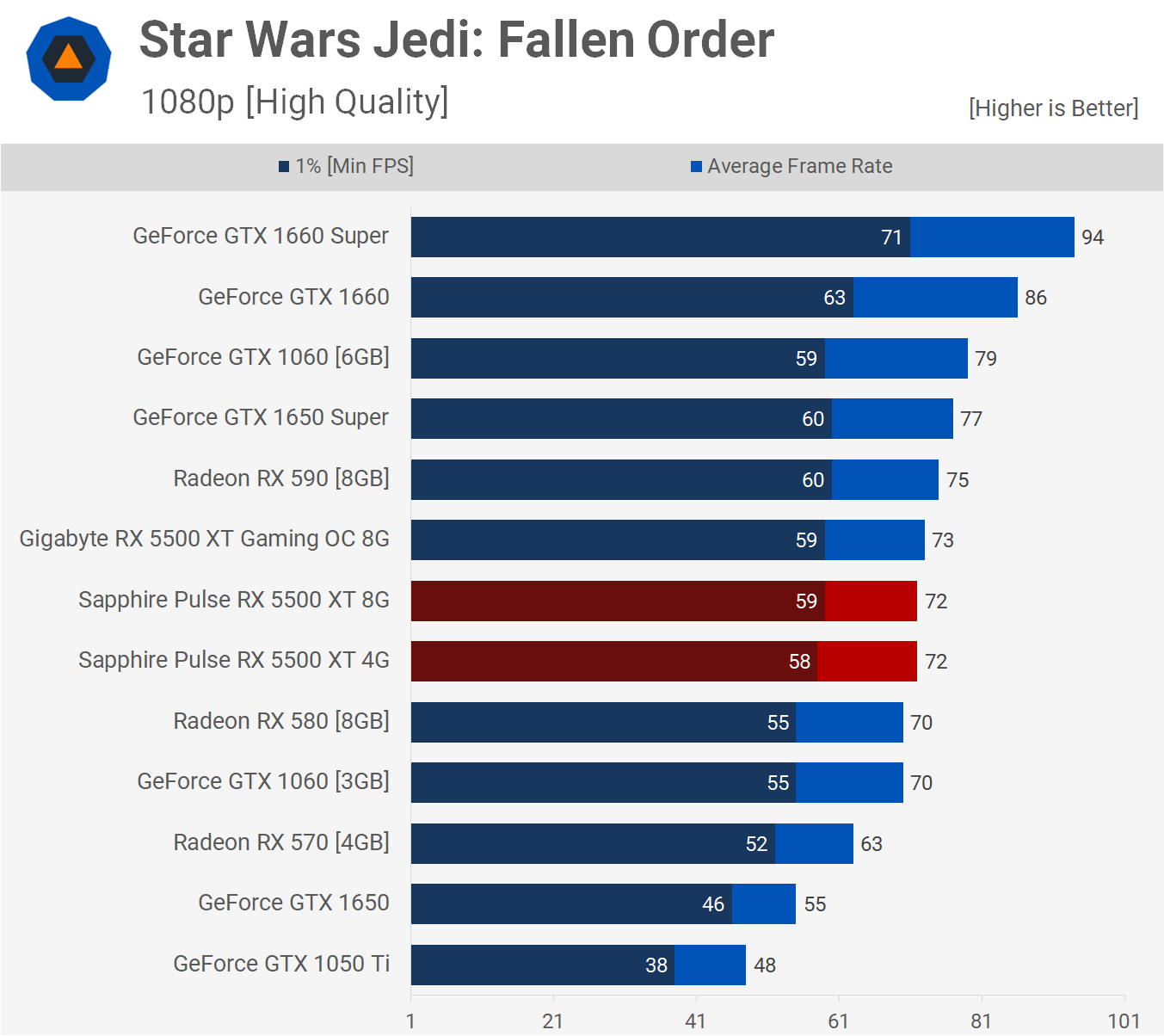 Next up we have Star Wars Jedi: Fallen Order and at 1080p using the high quality preset which is one step below the max 'Ultra' setting, we see no difference in performance between the 4GB and 8GB versions of the 5500 XT.