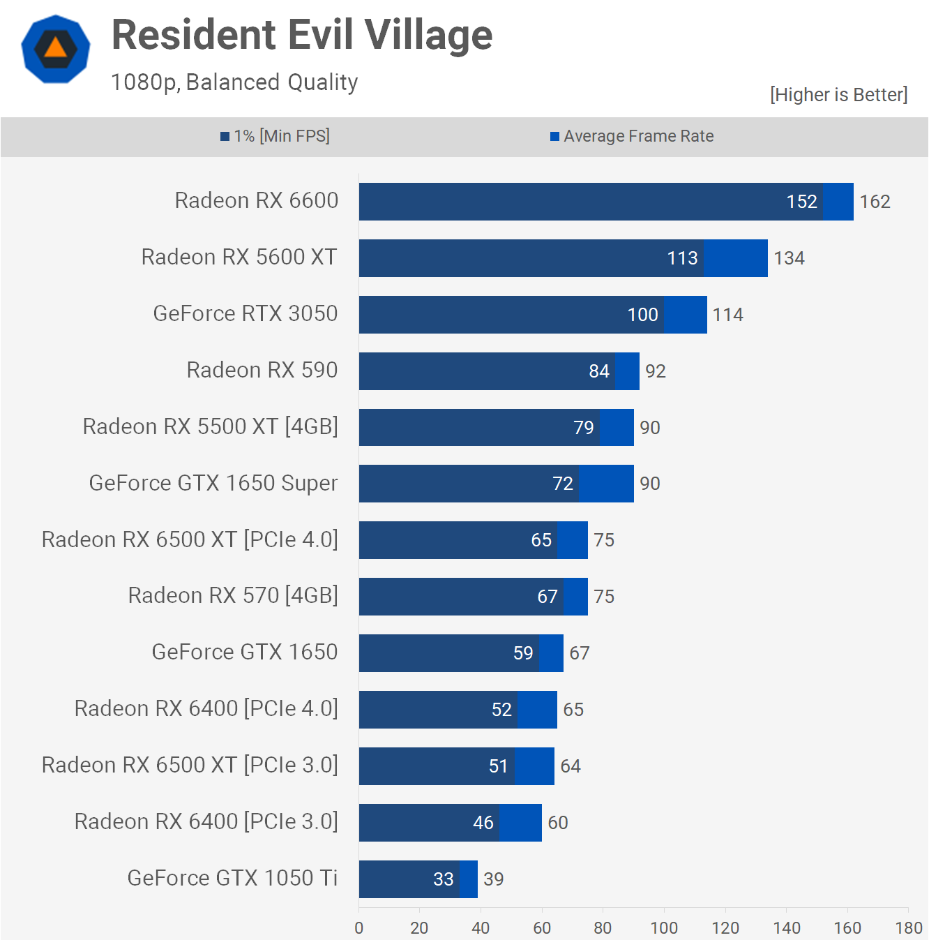 Resident Evil Village was tested using the balanced quality preset, which is a medium type setting and here we were able to average 60 fps using either PCIe 3.0 or 4.0 with the RX 6400, so the game was at least playable. Still, even when using PCIe 4.0 it was still 13% slower than the RX 570, so that's a bit rough given the price.