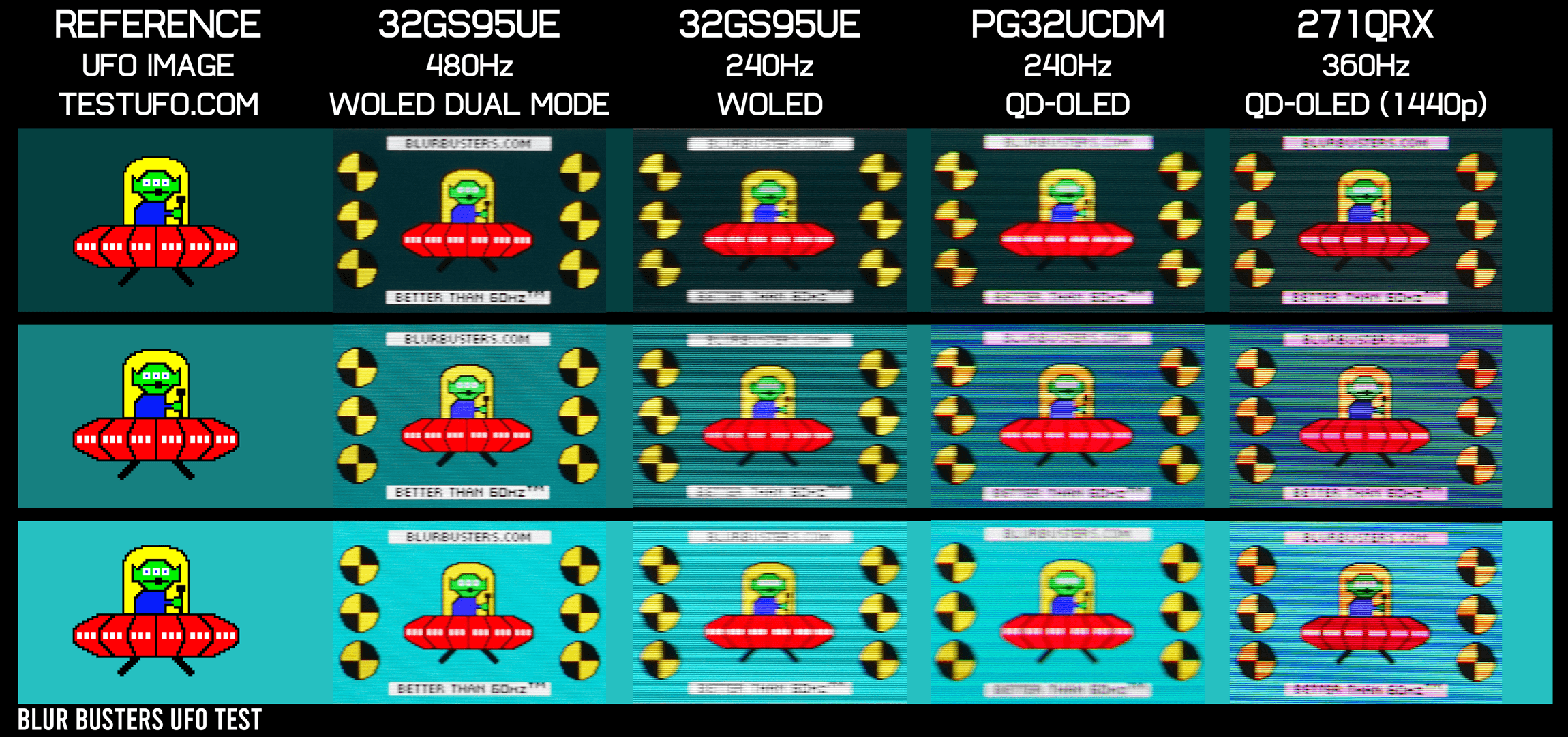 This gives 4K WOLED monitors a clear advantage in motion clarity for competitive gaming because the refresh rate can be double that of QD-OLED. When examining Blur Busters UFO Test results, the difference in clarity between a 240Hz and 480Hz OLED is evident: the 480Hz image is simply much clearer, and elements such as fast-moving text are easier to parse in motion. With a clearer, less blurry image in motion at 480Hz, competitive gamers have an advantage in spotting enemies in fast-paced battle scenarios.
