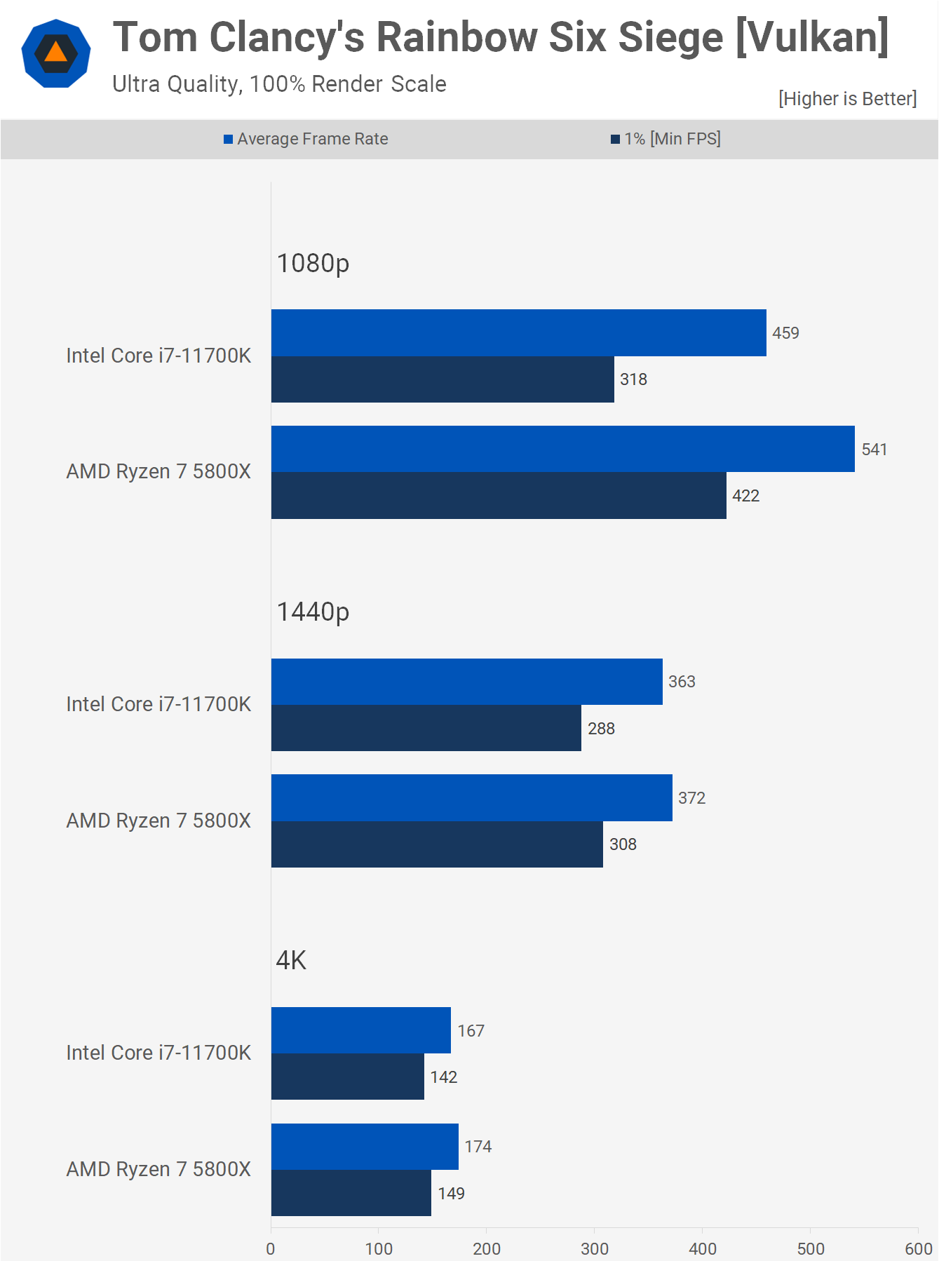 One of the biggest issues we saw with Intel's 11th gen Core series was the regression in performance seen in some games. One such example is Tom Clancy's Rainbow Six Siege. We saw in our 11900K review that the new flagship was 7% slower than the part it was replacing, and that handed AMD the win.