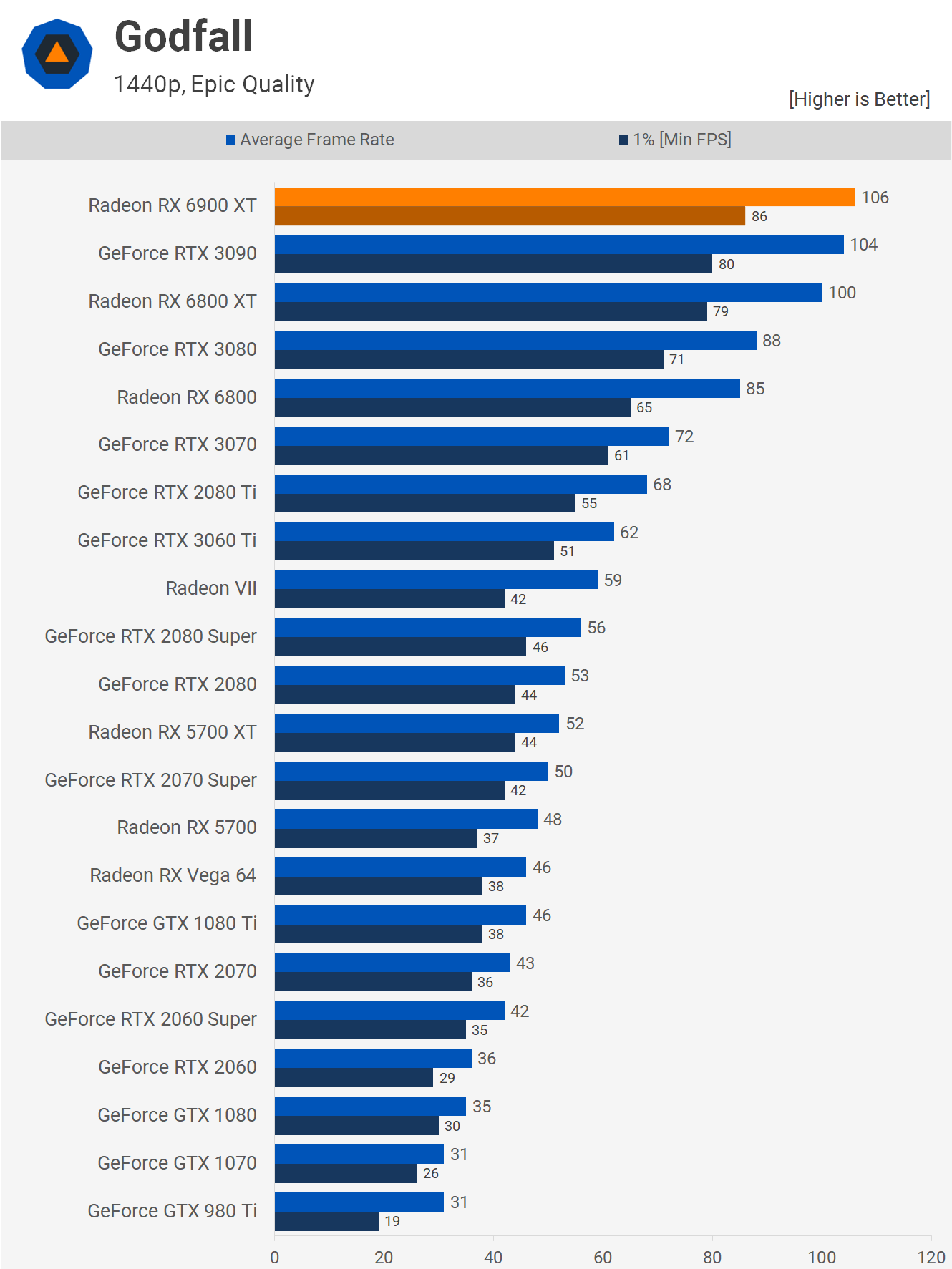 The last game we're going to show individually is Godfall, where the 6900 XT was 6% faster than the 6800 XT and just 2% faster than the 3090 at 1440p.