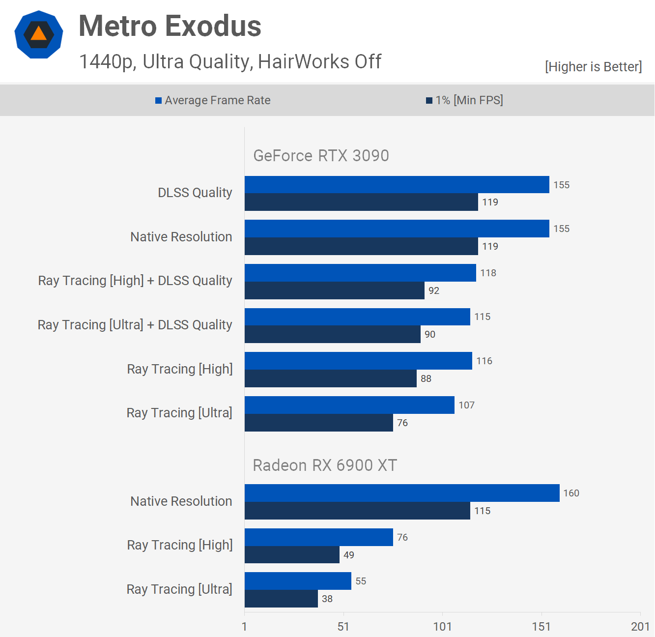 Like Control, Metro Exodus was optimized for Turing, so it plays well with Ampere and not so well with RDNA2's RT support. Here we're looking at a 66% reduction in performance when using ultra quality ray tracing with the 6900 XT, but just a 31% reduction with the RTX 3090.