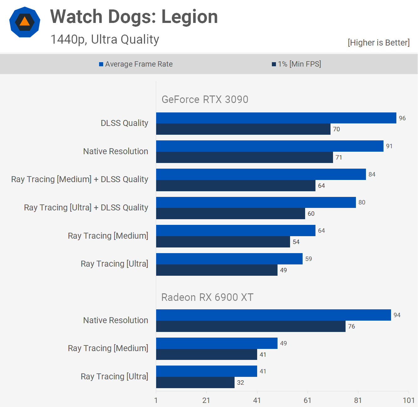 Next we have Watch Dogs Legion and at 1440p the 6900 XT was 11% faster than the 6800 XT, jumping up to 85 fps to 94 fps, nudging it ahead of the RTX 3090.