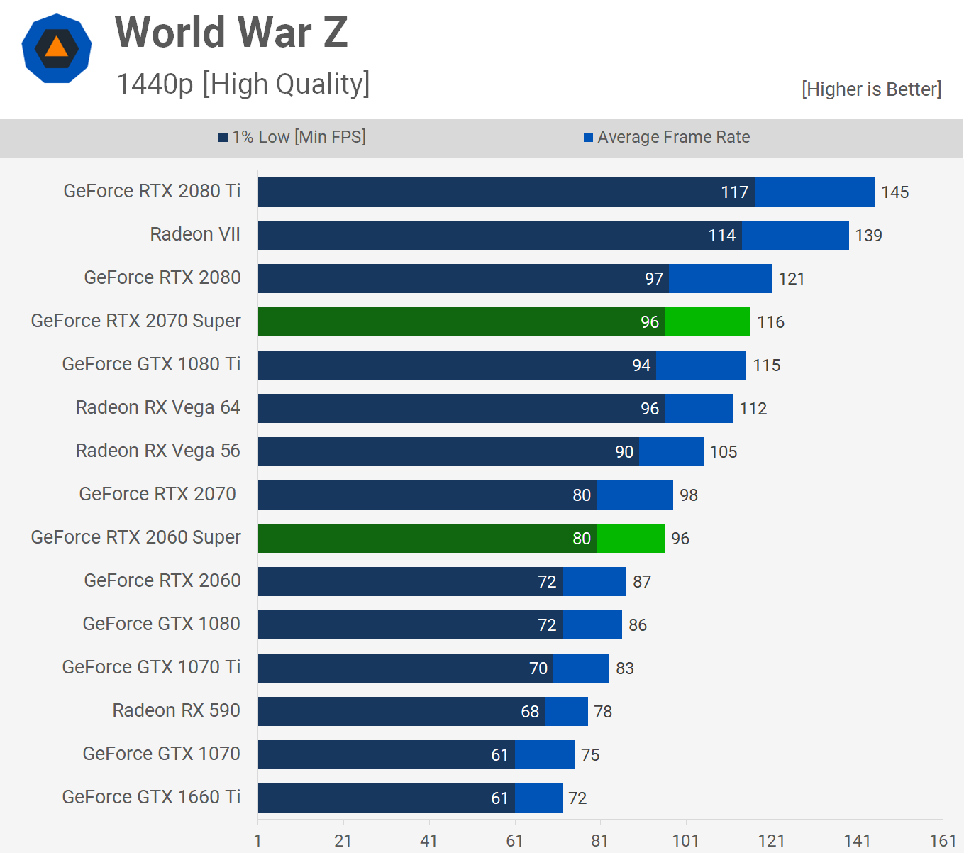 In World War Z the RTX 2060 Super couldn't keep pace with Vega 56, while the Radeon VII was significantly faster than the 2070 Super. Still relative to Nvidia's own product stack these new Super versions performed quite well.