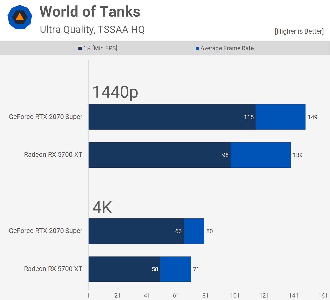 Finally we have World of Tanks where the 2070 Super was 7% faster on average at 1440p with both GPUs averaging over 130 fps.