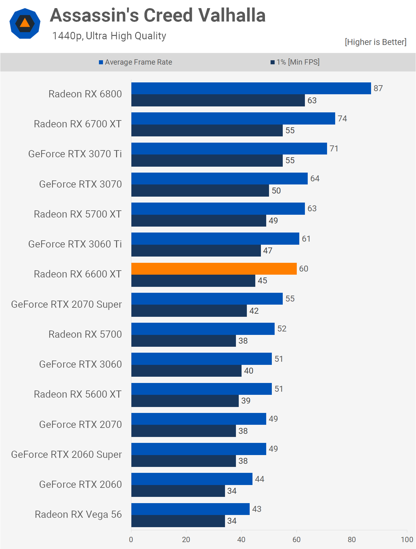 Starting with Assassin's Creed Valhalla, the 6600 XT gets off to a flyer, beating the RTX 3060 Ti by a convincing 13% margin and the standard 3060 by a massive 31%. We're looking at RTX 3070 Ti-like performance in this game, while still lagging behind the 6700 XT.