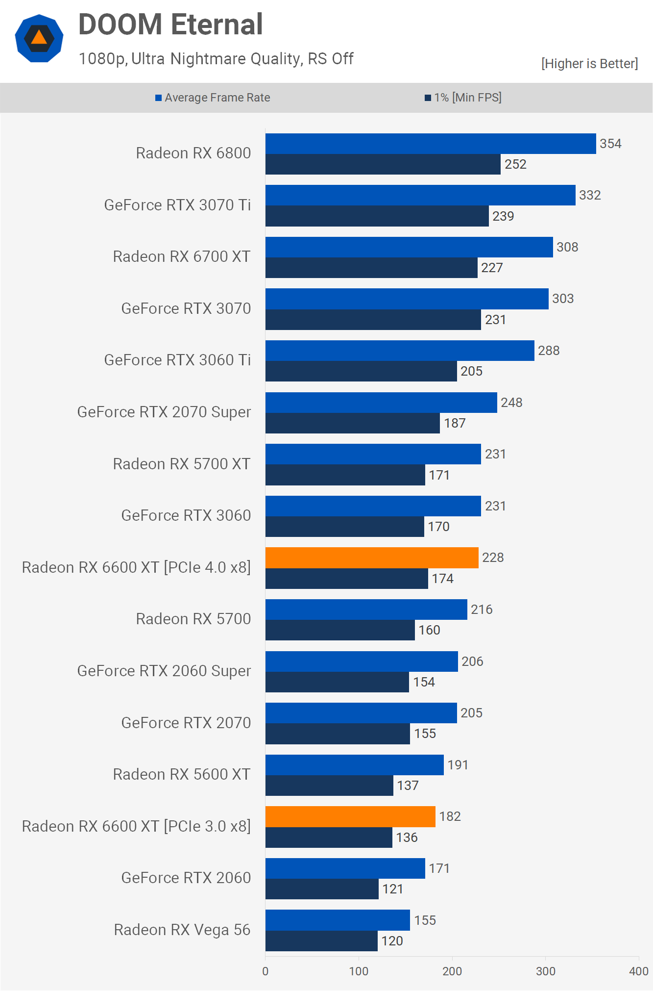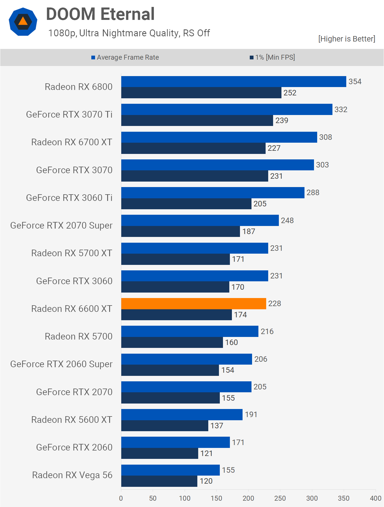Doom Eternal is even more brutal for the 6600 XT, dropping from 228 fps on average to just 60 fps with ray tracing. Meanwhile, the RTX 3060 Ti dropped from 288 fps to 150 fps and while that's an extreme 92% performance hit, the frame rate at 1080p was still far more than what most gamers would require at 150 fps on average.