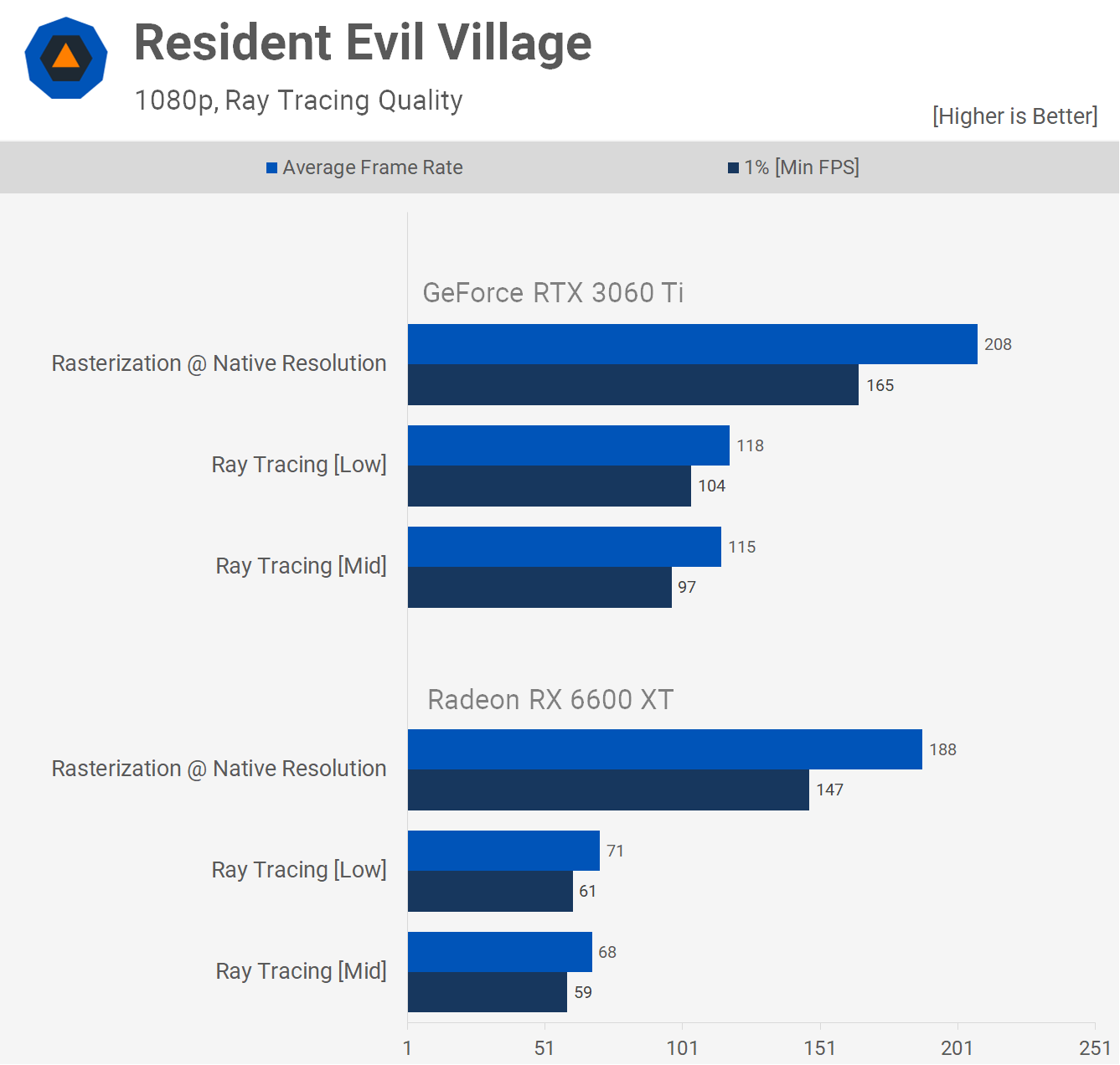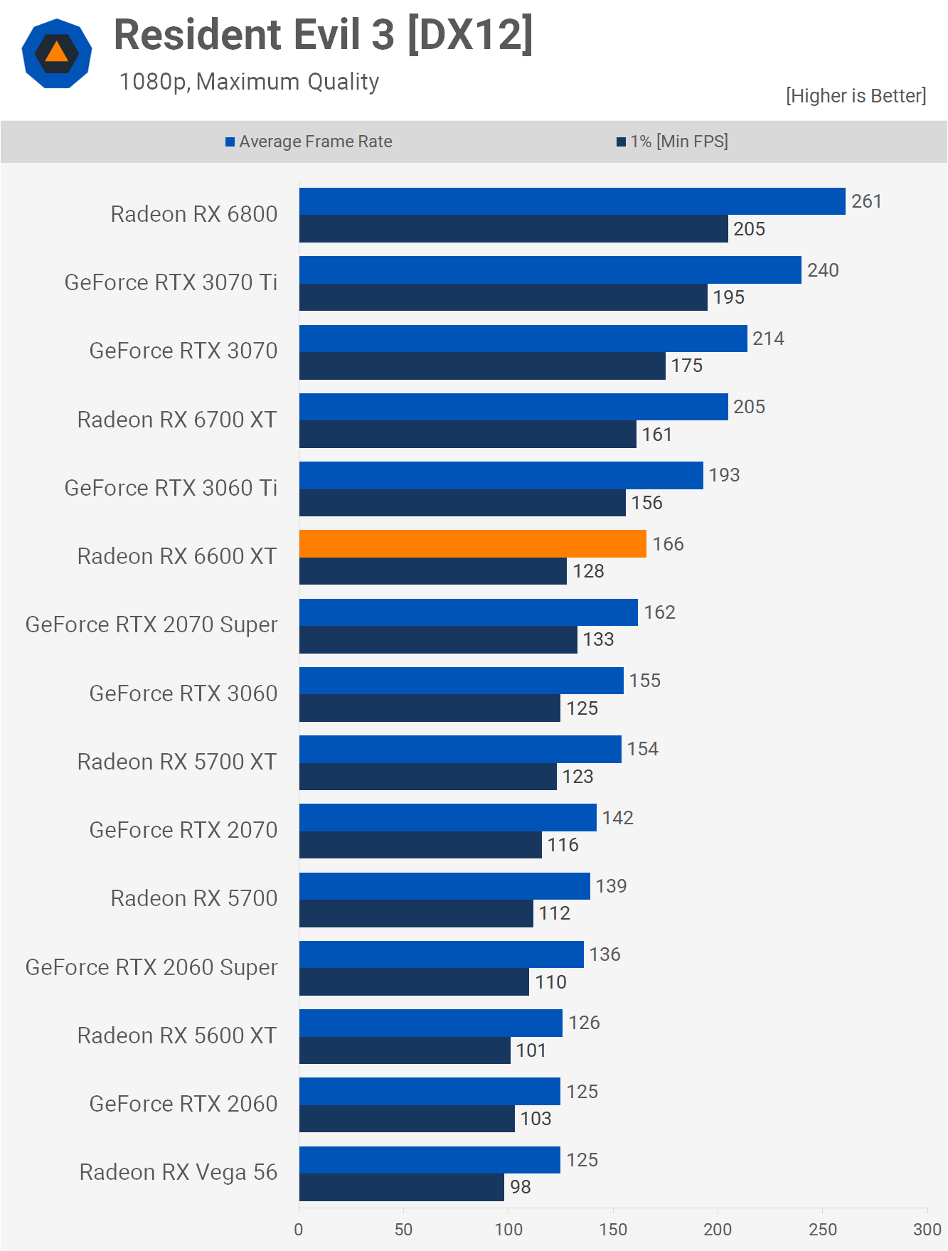 Resident Evil 3 has the 6600 XT good for 166 fps on average at 1080p. That's 7% faster than the 3060, while lagging behind the Ti version by 14%.