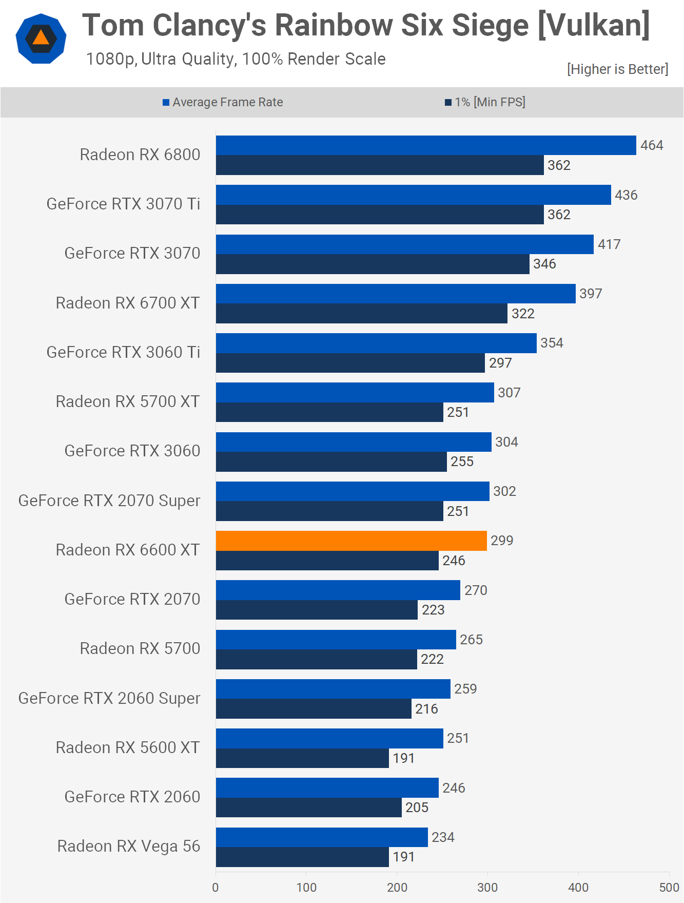 Those of you playing Tom Clancy's Rainbow Six Siege at 1080p probably don't require the 6600 XT, but in case you do, here are the results. The new Radeon GPU was good for around 300 fps on average and that's the same level of performance you'll receive from the old 5700 XT or 2070 Super, or the newer and cheaper RTX 3060. So not a particularly impressive showing given it was 25% slower than the 6700 XT.