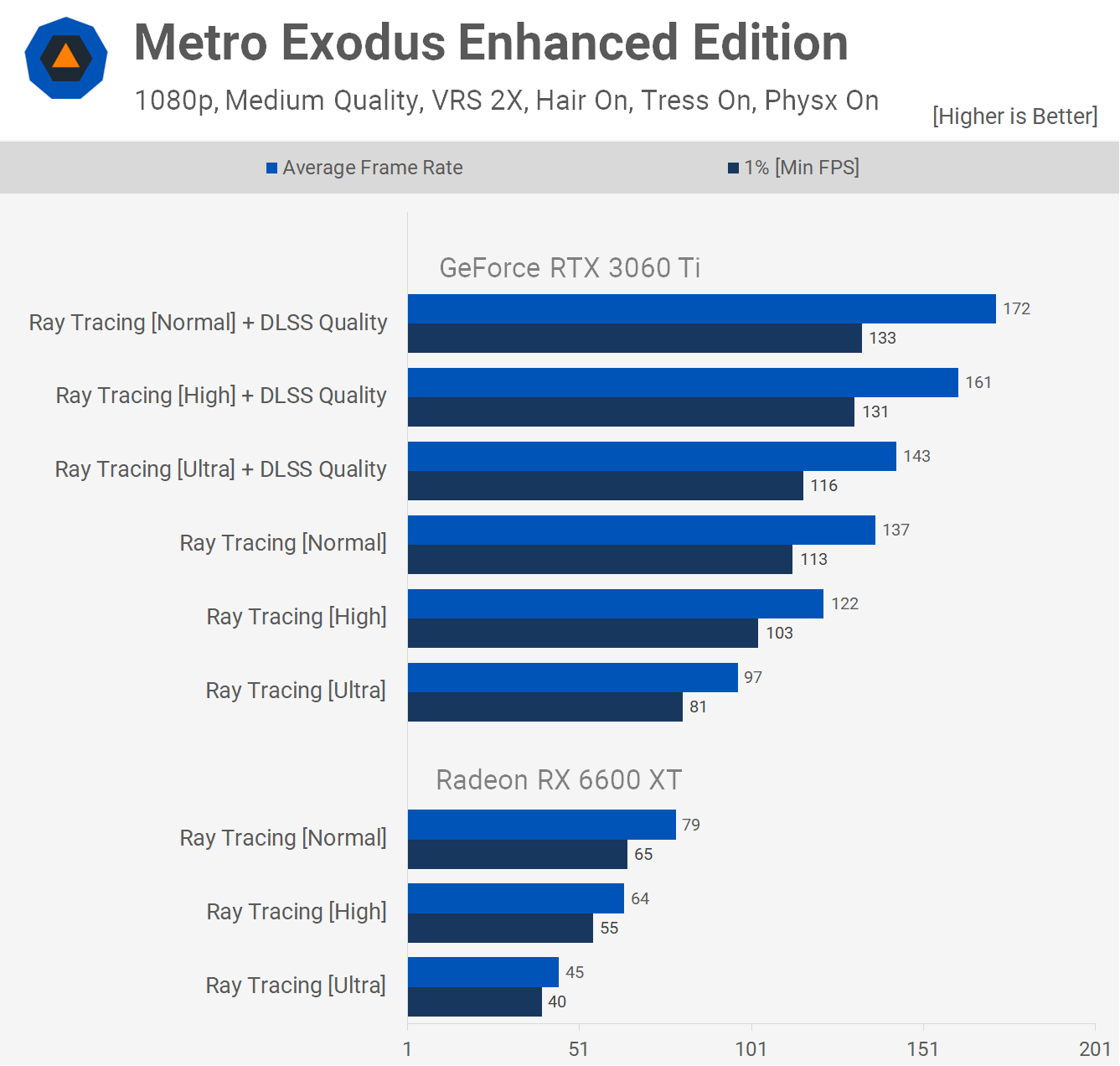 Metro Exodus Enhanced Edition can only be played with a GPU supporting real-time hardware accelerated ray tracing and is therefore enabled by default. Using the lowest level, which is labeled as 'normal', the 6600 XT was almost 50% slower than the 3060 Ti and although it did still deliver playable performance, 137 fps is worlds better than 79 fps.