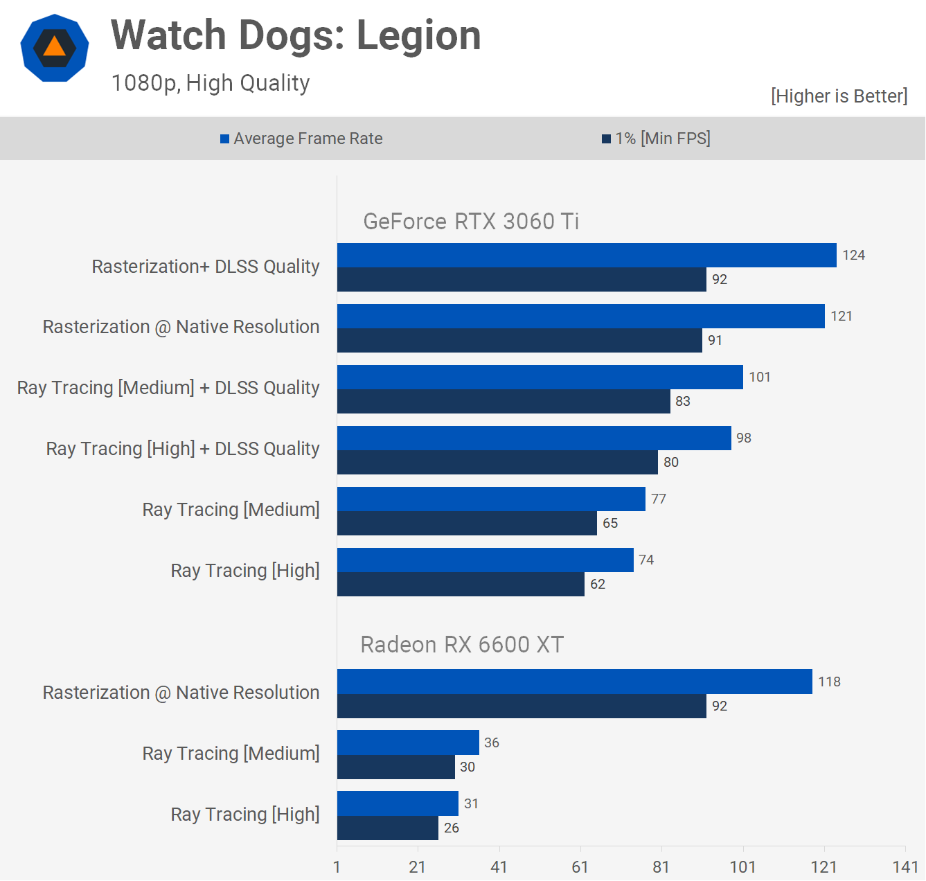 Watch Dogs: Legion is another game where the 6600 XT proves its essentially a 5700 XT in terms of performance. With 72 fps on average, it found itself situated between the RTX 3060 Ti and 3060 at 1080p, but that meant it was 18% slower than the 6700 XT, which isn't a bad result.