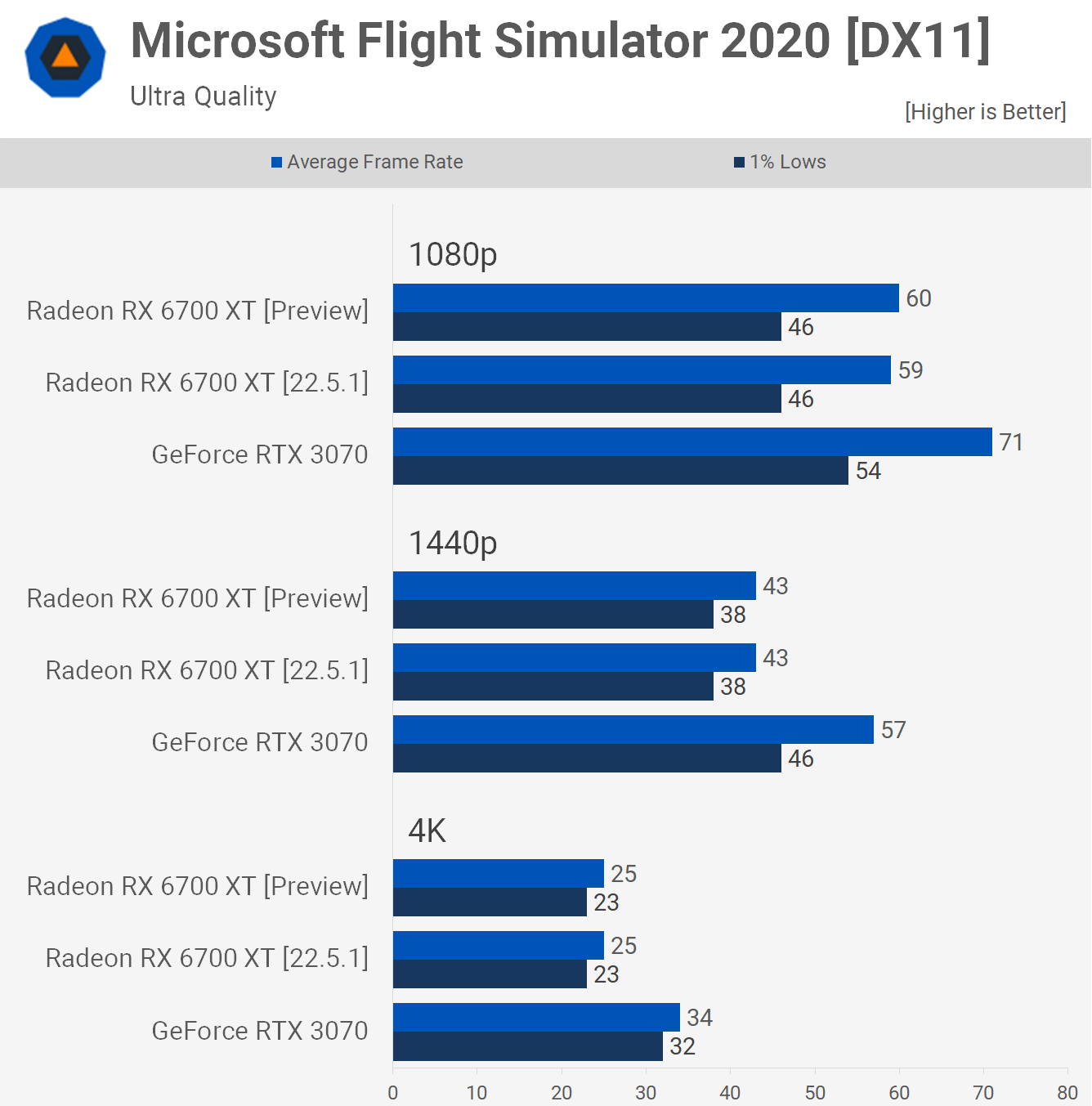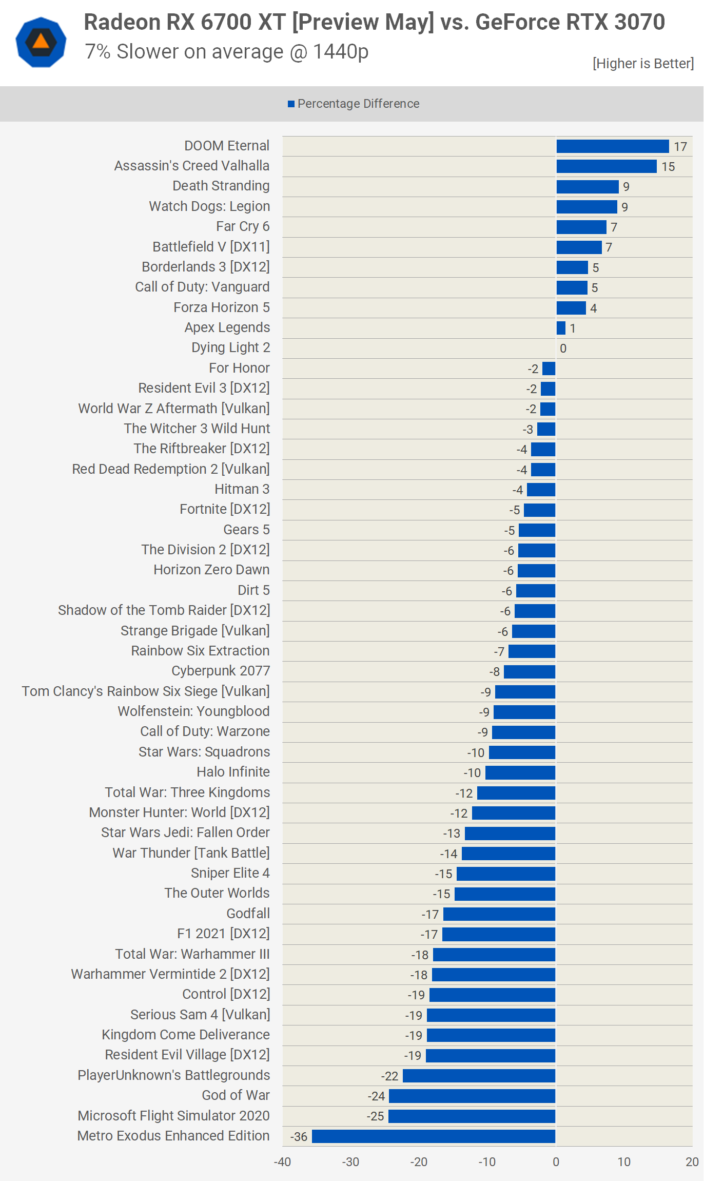 This is good for the 6700 XT in its fight with the RTX 3070 because previously at 1440p the Radeon GPU was 4% slower, but now it's 9% faster with the preview driver.