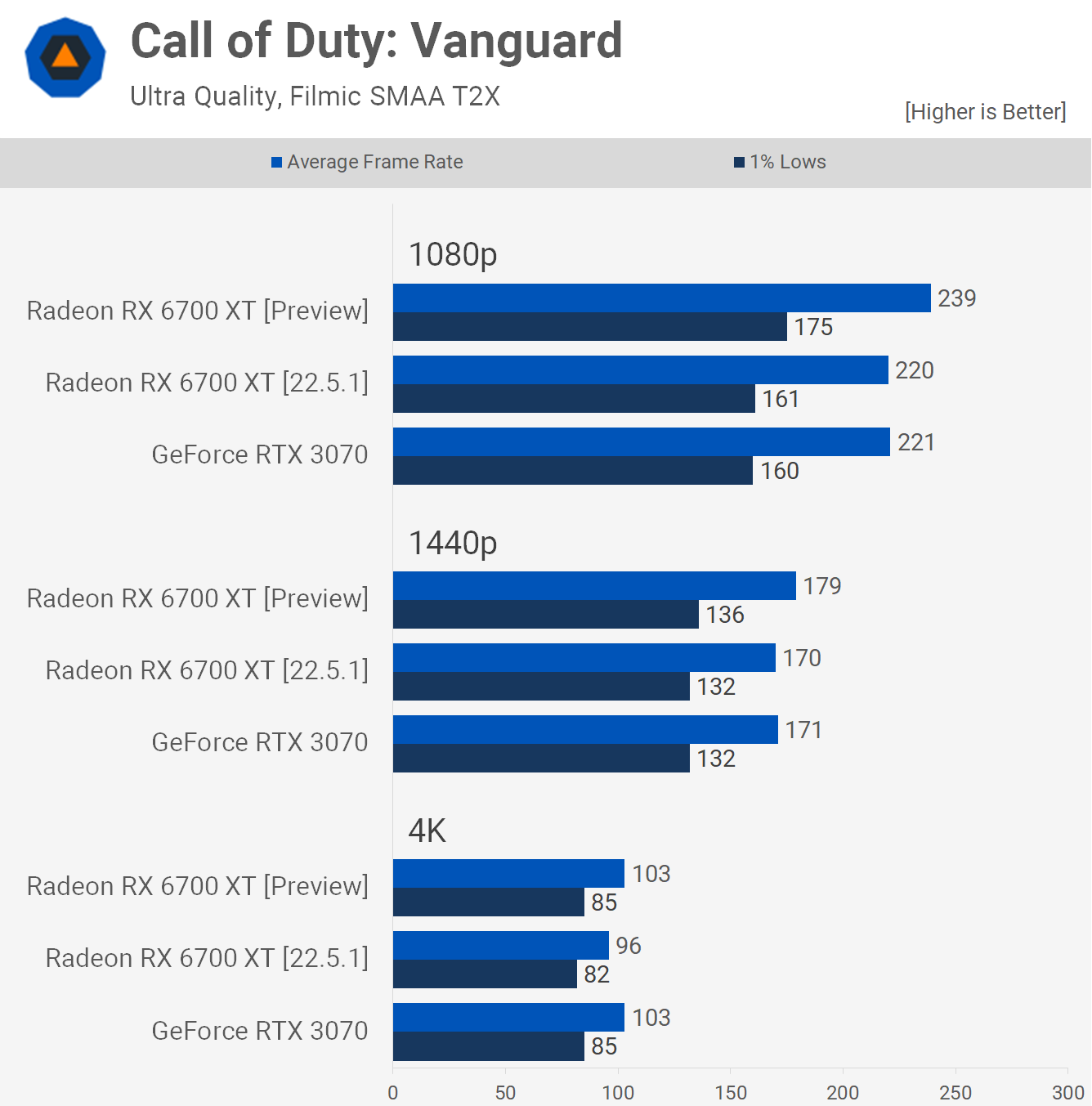 Interestingly, Call of Duty Vanguard which by default uses DX12, still saw a performance improvement with the preview driver. At 1080p frame rates were improved by 9%, then a more mild 5% at 1440p and 7% at 4K. This was enough to give the 6700 XT a performance advantage at 1080p and 1440p while it caught the RTX 3070 at 4K.