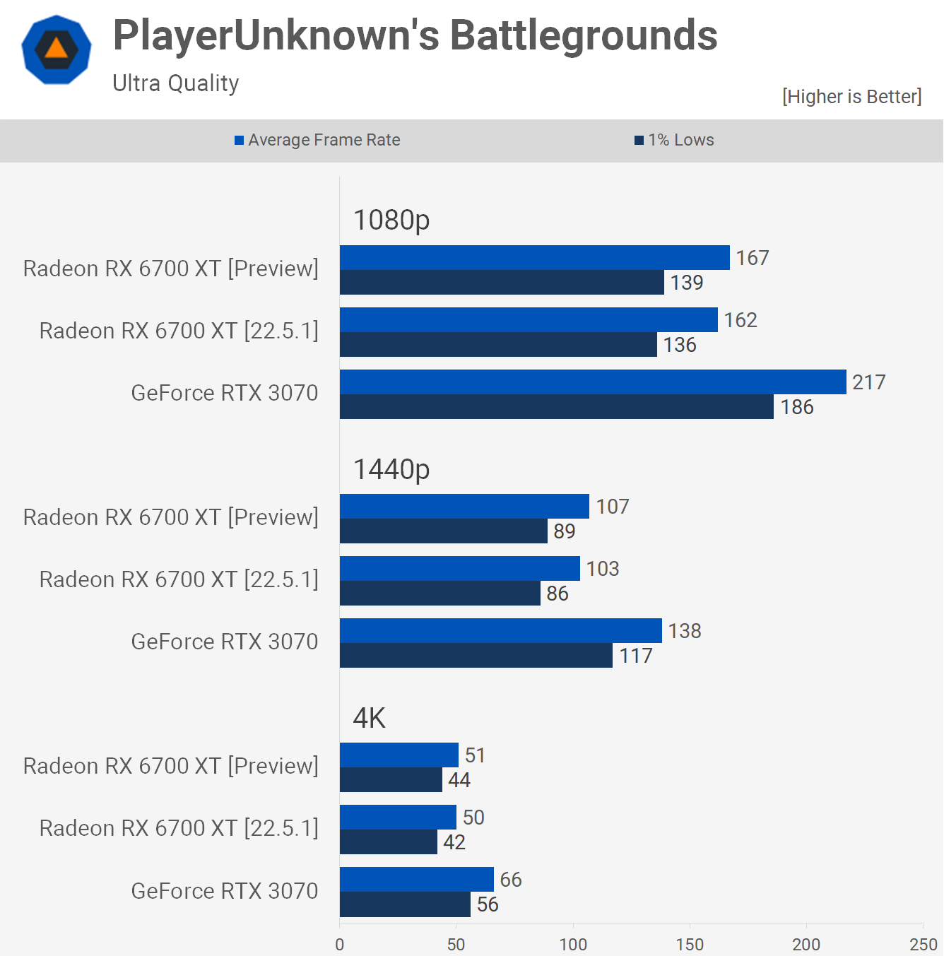 We also test PUBG using DX11 and here the Radeon GPUs generally get crushed by the GeForce competition and the preview driver didn't help much to change that. We're looking at 3-4% more performance which is basically nothing when you consider that the RTX 3070 is still 30% faster at 1080p.