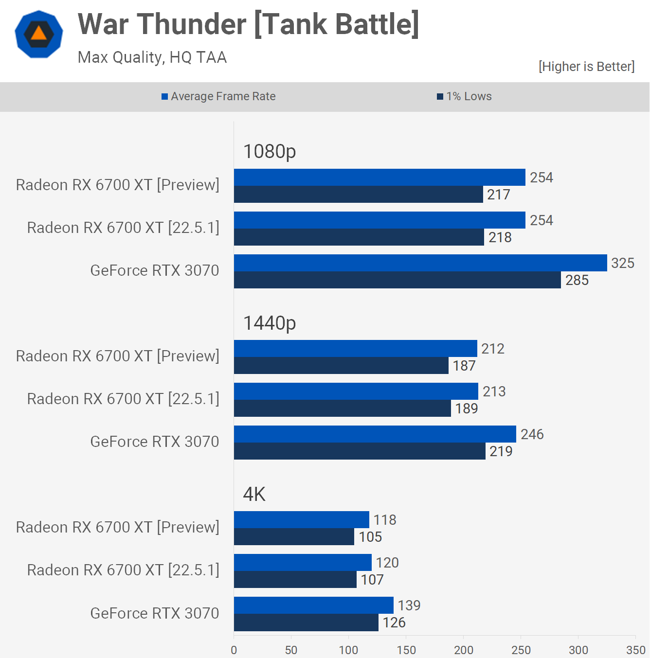 War Thunder is another DX11 title that saw no performance improvement with the preview driver, and this is another title where Nvidia doesn't have a substantial performance advantage.