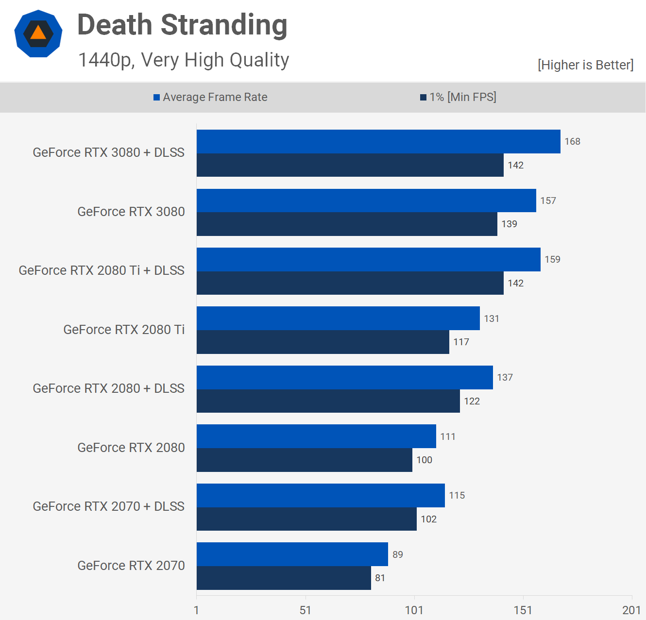 What this means in practice is that with DLSS enabled, the RTX 3080 is 27% faster than the 2080 Ti in Death Stranding, while without DLSS, the 3080 is 29% faster. You're still getting that class-above performance with the 3080, native 4K performance is similar to what the 2080 Ti can do at 4K with DLSS which is impressive.
