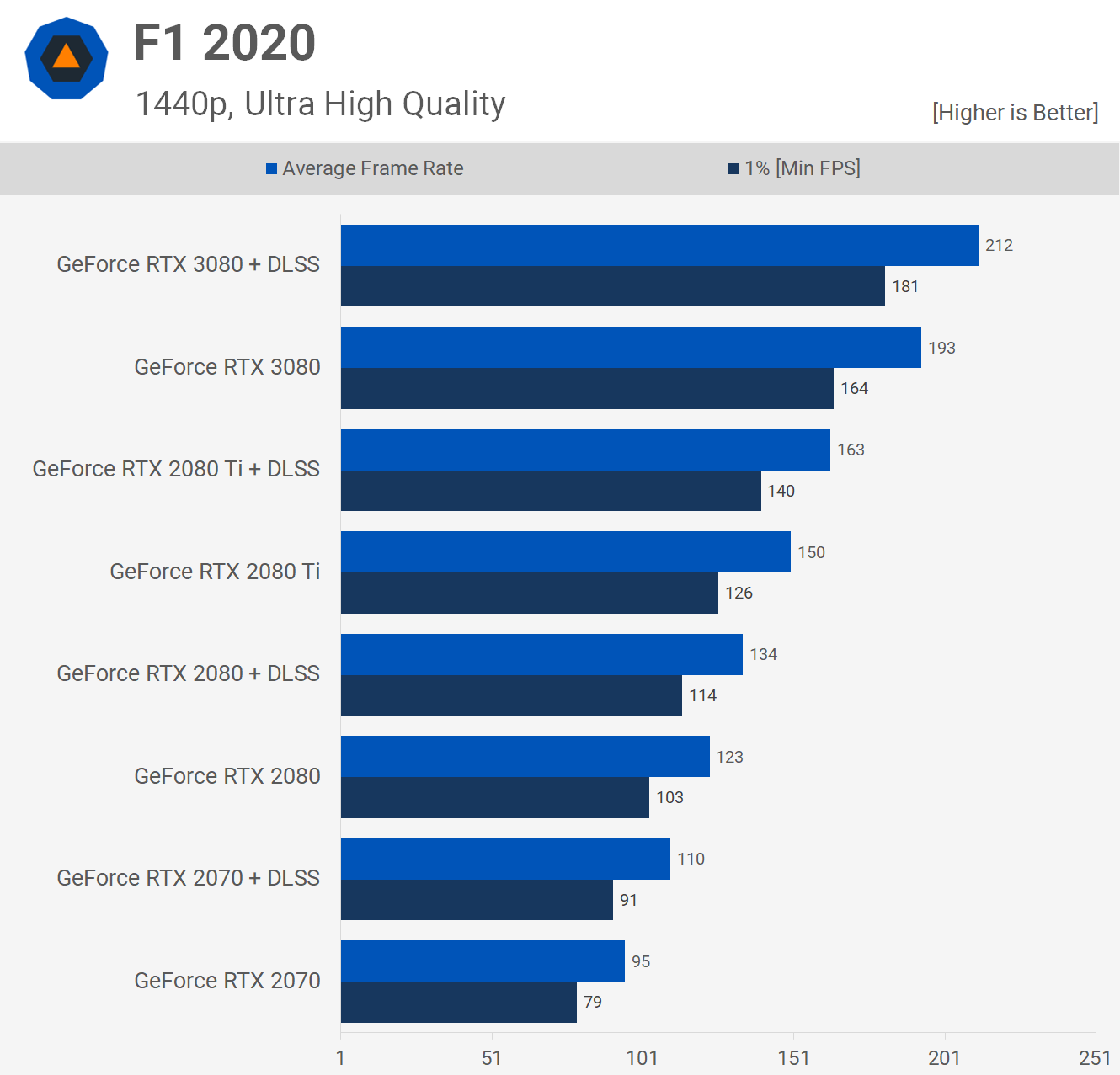 F1 2020 was recently updated to include DLSS 2.0 support. At 4K using the Ultra High quality preset, the 3080 can benefit from DLSS just as it did on Death Stranding, with a 20 percent performance gain. This allows it to be 34 percent faster than the 2080 Ti with DLSS enabled, although the acceleration gains are similar for DLSS between Turing and Ampere.