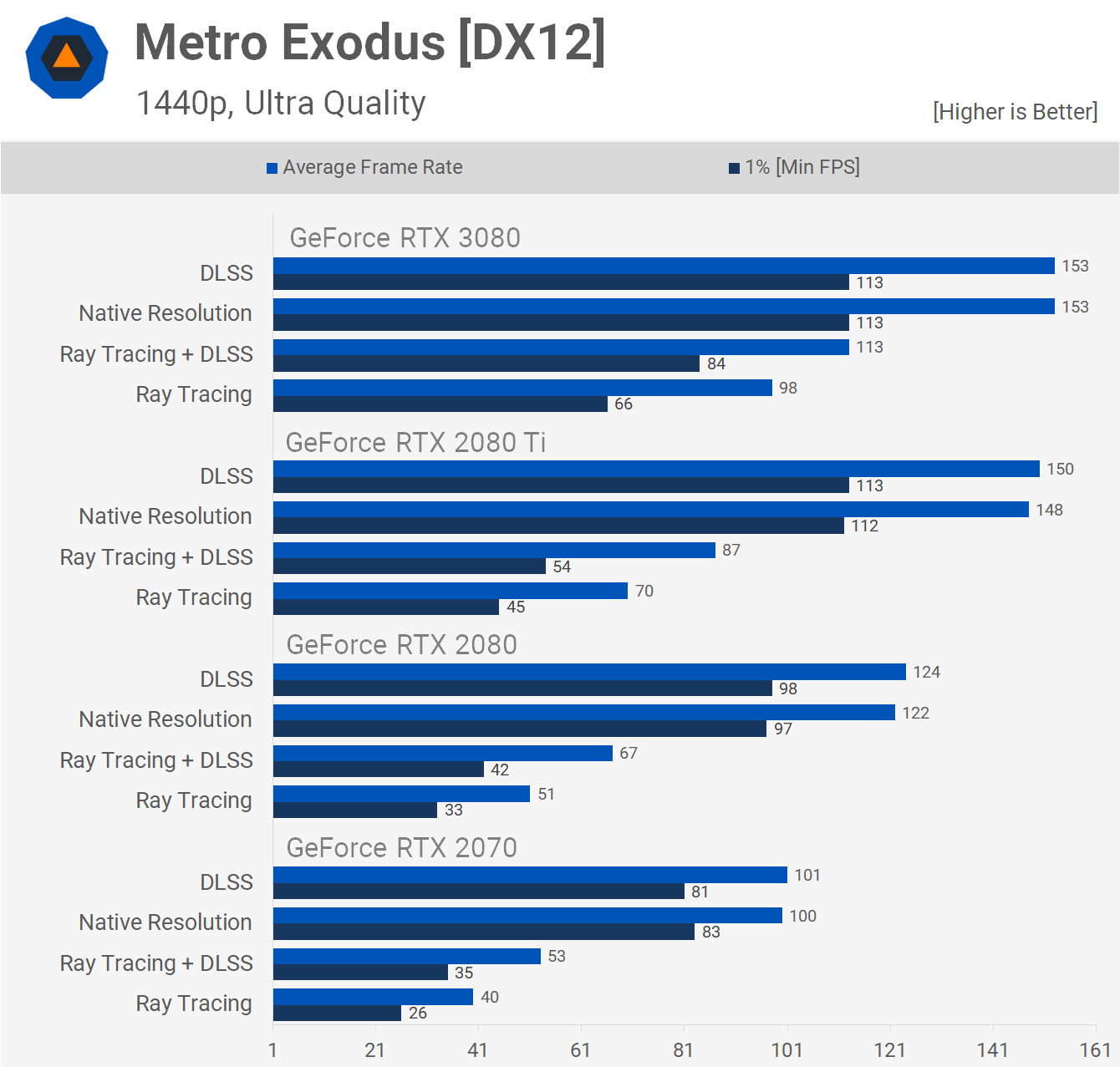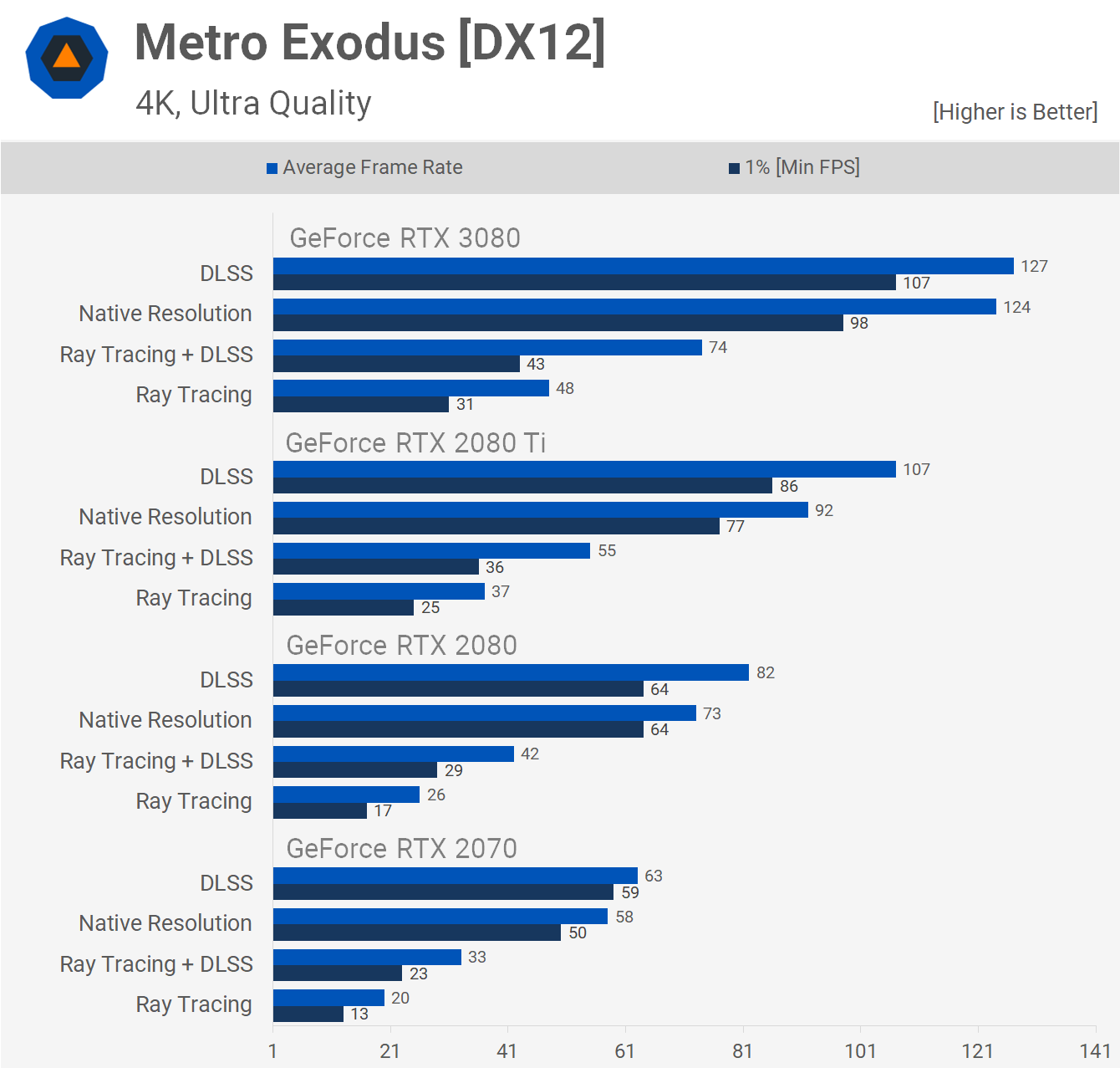 We'll start with the oldest ray tracing game in our line-up, Metro Exodus. This is an interesting one because the game only supports DLSS, not DLSS 2.0, so the image quality you gain from the feature is lackluster to put it lightly. What we're interested in here is whether the RTX 3080 is a capable card for native resolution ray tracing, because we can't imagine you will want to play with DLSS enabled in this title.