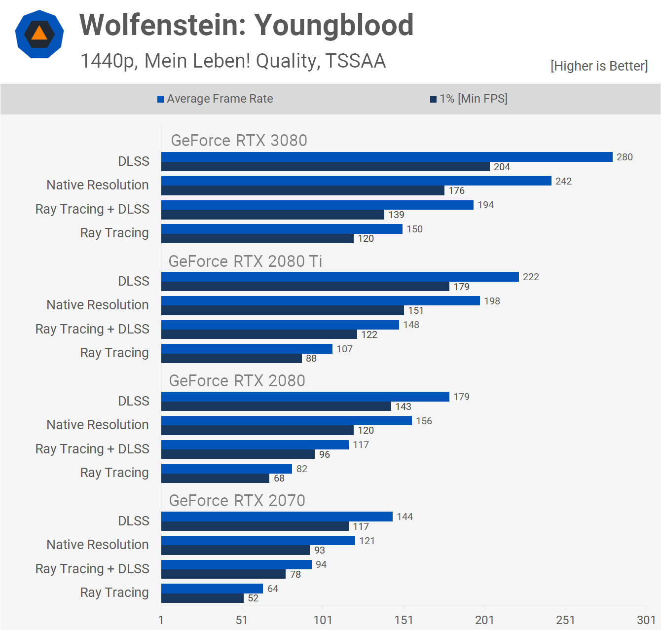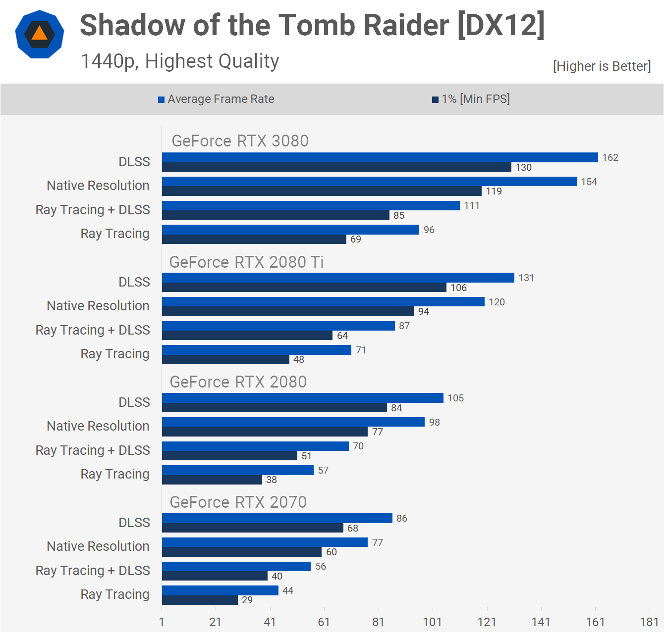 The gains aren't as significant at 1440p in this title, with the 2080 Ti and 3080 providing similar acceleration capabilities.