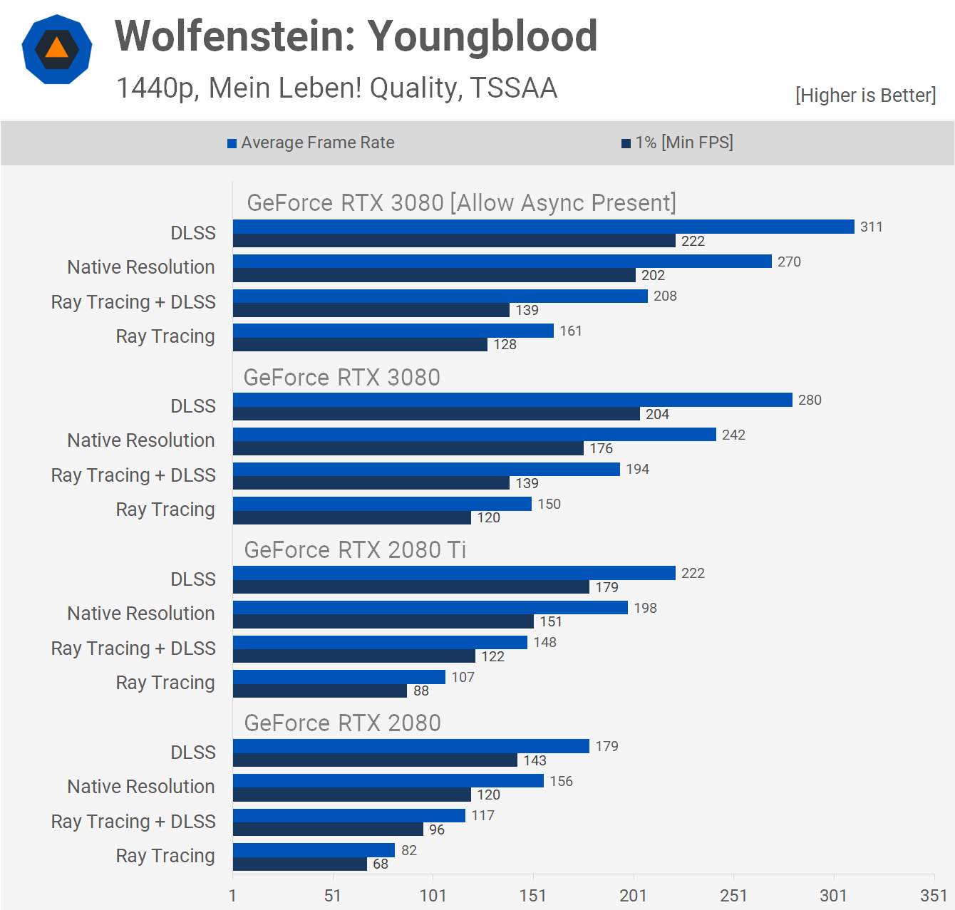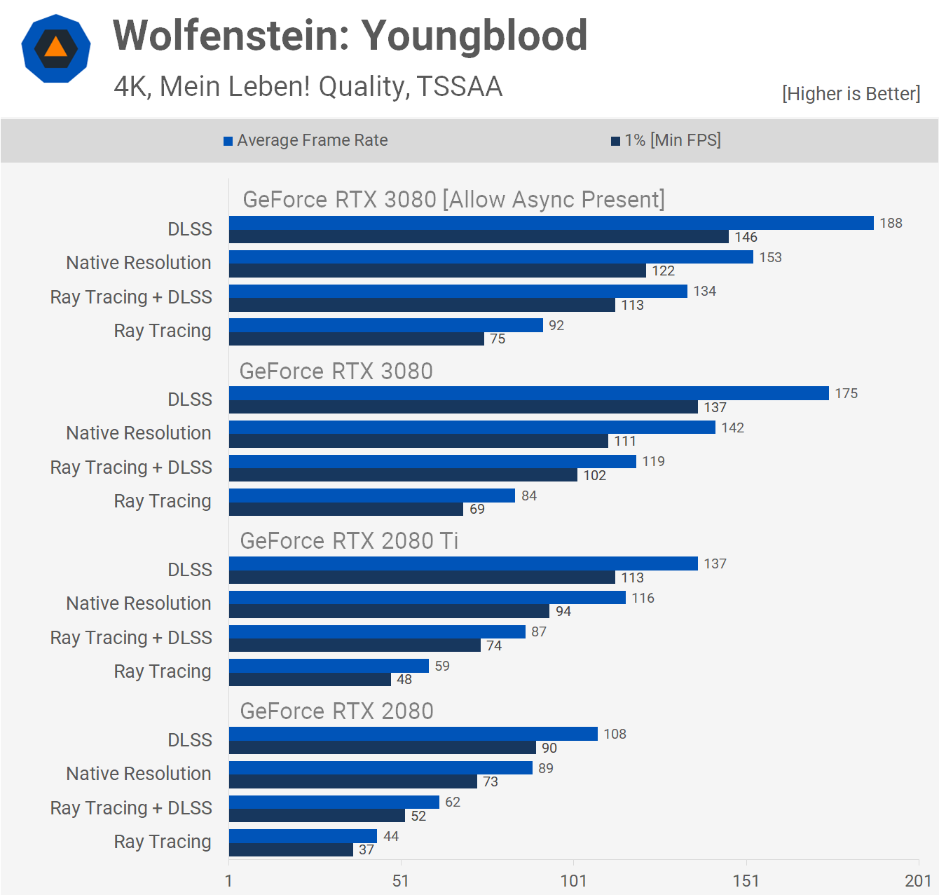 Next up is Wolfenstein: Youngblood and what we have here are two separate sets of data for the RTX 3080. The first set is with the game's current code, and the other, labelled "allow async present", is performance with an upcoming patch that is designed to better utilize Ampere's asynchronous compute capabilities (particularly for ray tracing).