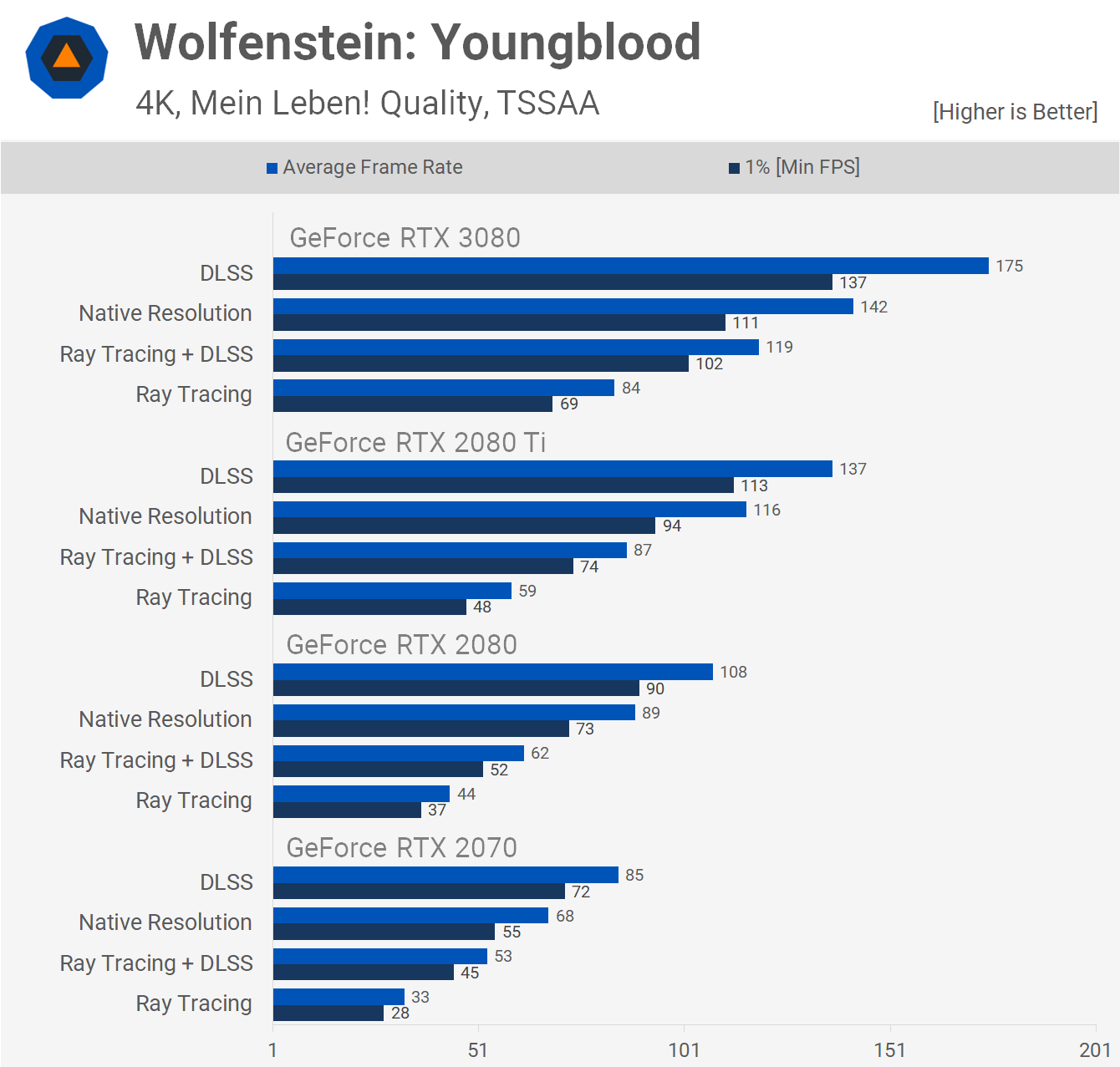 Our tests also show that ray tracing acceleration in the RTX 3080 isn't overly better than the 2080 Ti's, with less than a 10% speed up to RT acceleration separating the two. In a best-case scenario like Wolfenstein: Youngblood at 4K which received an Ampere-specific patch to improve performance, the RTX 3080 is 25% better at ray tracing acceleration. Ideally, we'd need to see a 50% or even 100% improvement to RT acceleration before the RTX on and off gap feels more acceptable with today's effects.