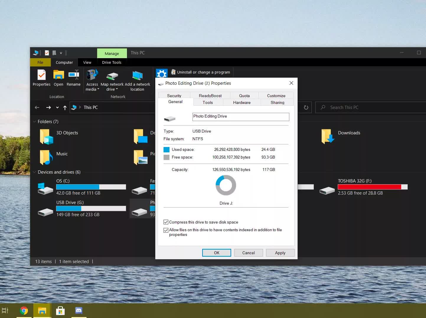 If you want to compress an entire drive, use File Explorer, and head over to "This PC." Then you need to right click on the drive you want to compress, and select Properties. Check the box next to "Compress this drive to save disk space," in the General Tab. Then click Apply. You'll then be prompted with a dialogue box asking if you want to apply the change to the drive, subfolders and files. Make your selection and click OK.