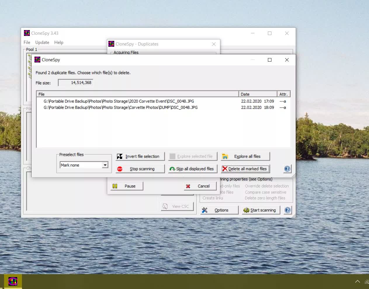CCleaner includes a duplicate file finder tool, as does Total Commander. Some applications specialize in finding and deleting duplicate files including CloneSpy, Wise Duplicate Finder, Duplicate Cleaner and DupScout.