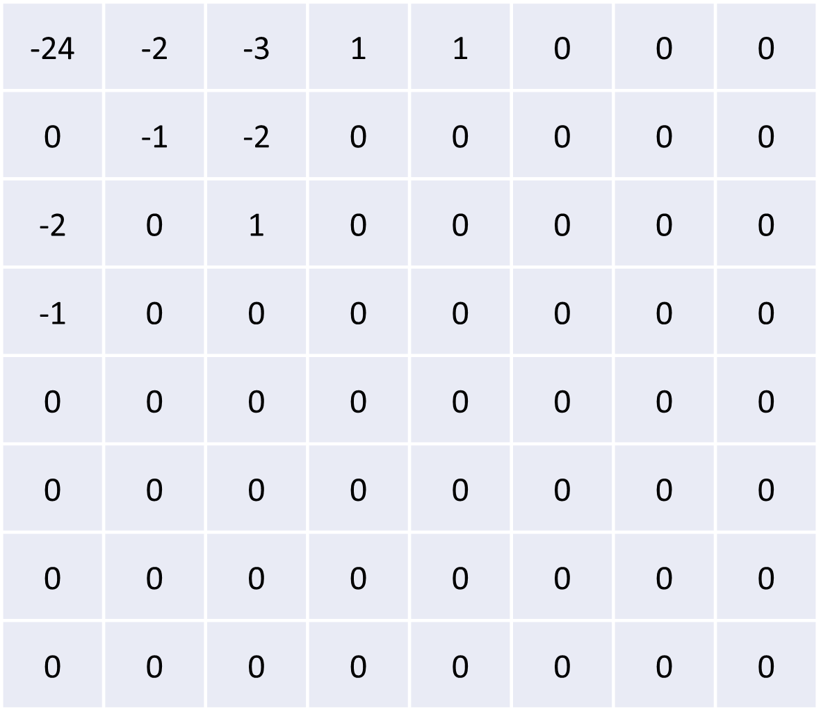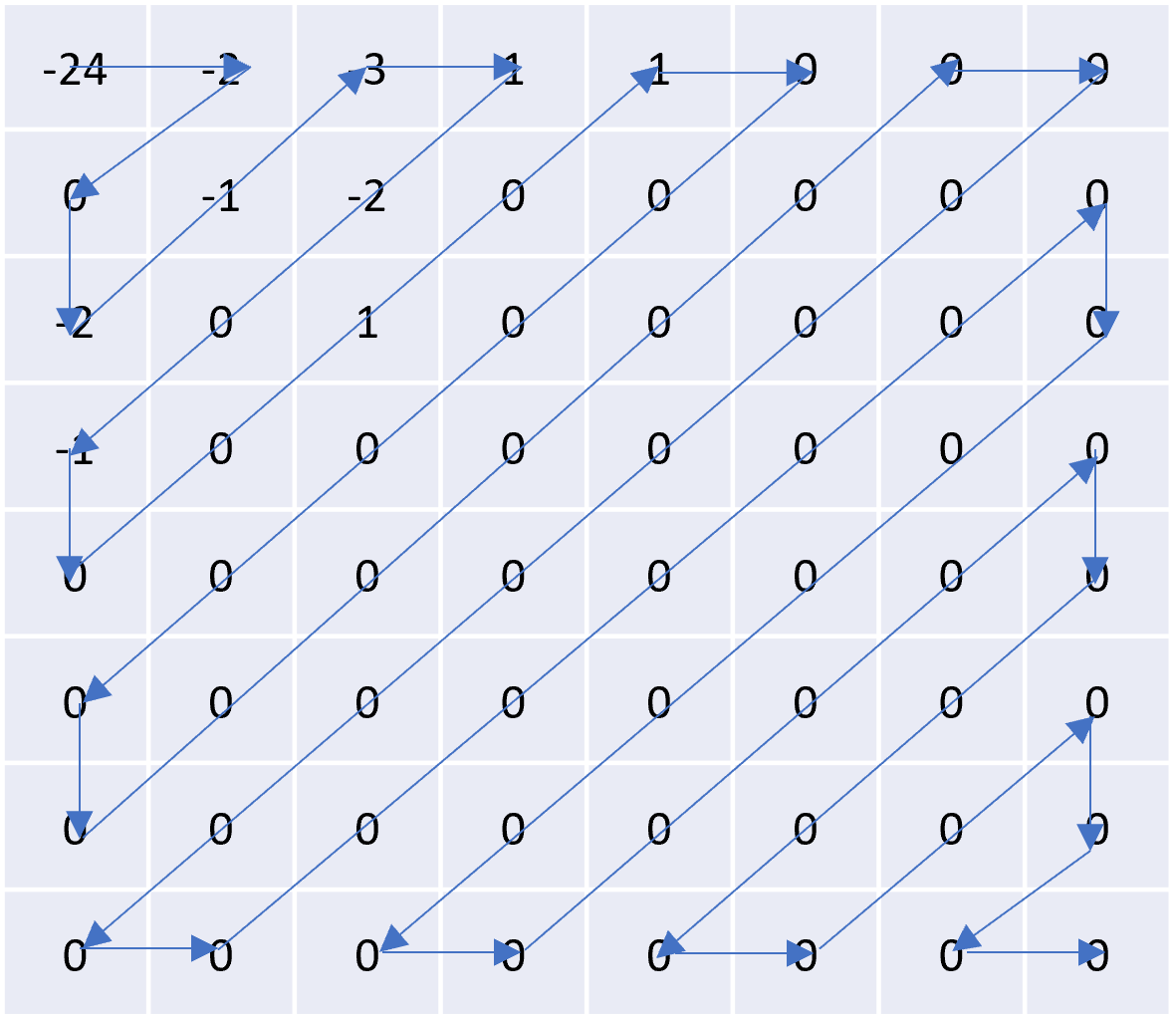With a quantized DCT, most values in the matrix are now zero. This lends itself to another cool technique to encode all the useful values efficiently, called run-length encoding.