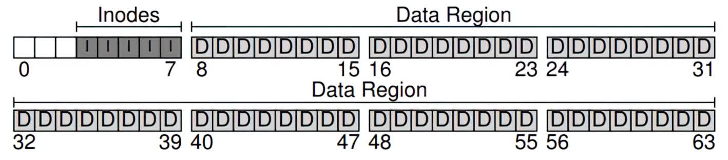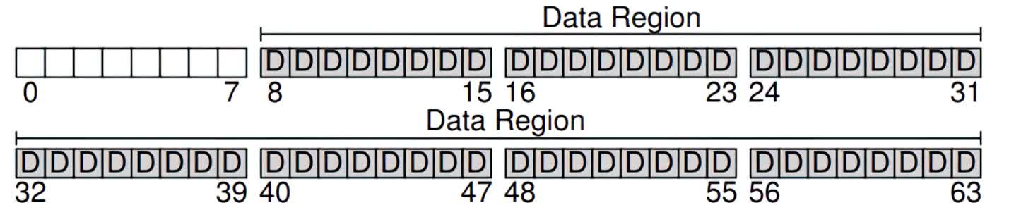 Now, let's break up these blocks into various regions. Let's set aside most of the blocks for user data, and call this the data region. In this example, let's fix blocks 8-63 as our data region:
