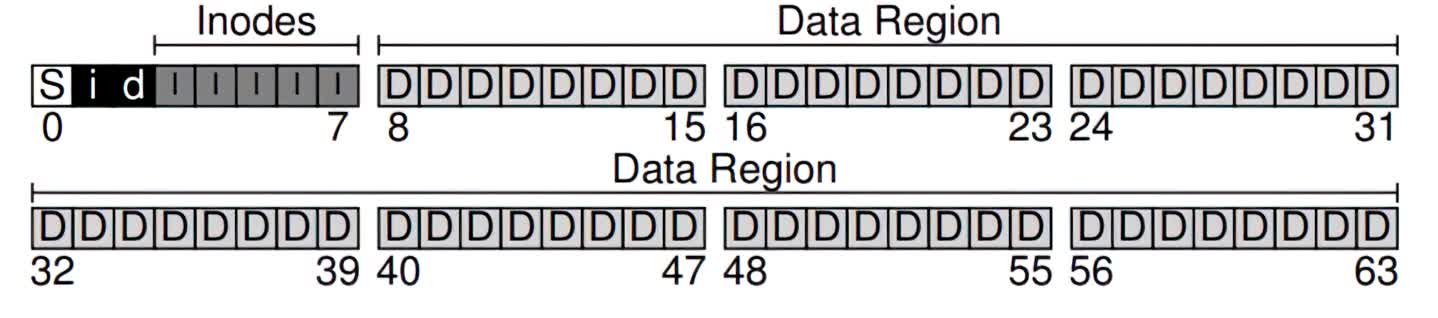 Adding a superblock (S), an inode bitmap (i), and a data region bitmap (d) to our simple system.