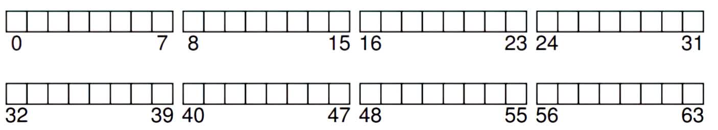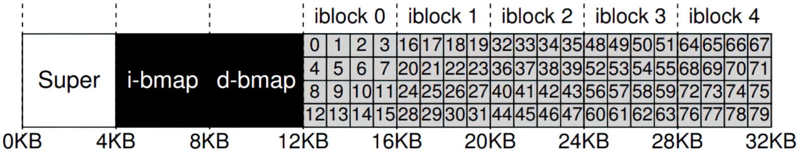 A bitmap is a very simple data structure: each bit corresponds to whether an object/block is free (0) or in-use (1). We can assign the inode bitmap and data region bitmap to their own block. Although this is overkill (a block can be used to track up to 32 KB objects, but we only have 80 inodes and 56 data blocks), this is a convenient and simple way to organize our file system.