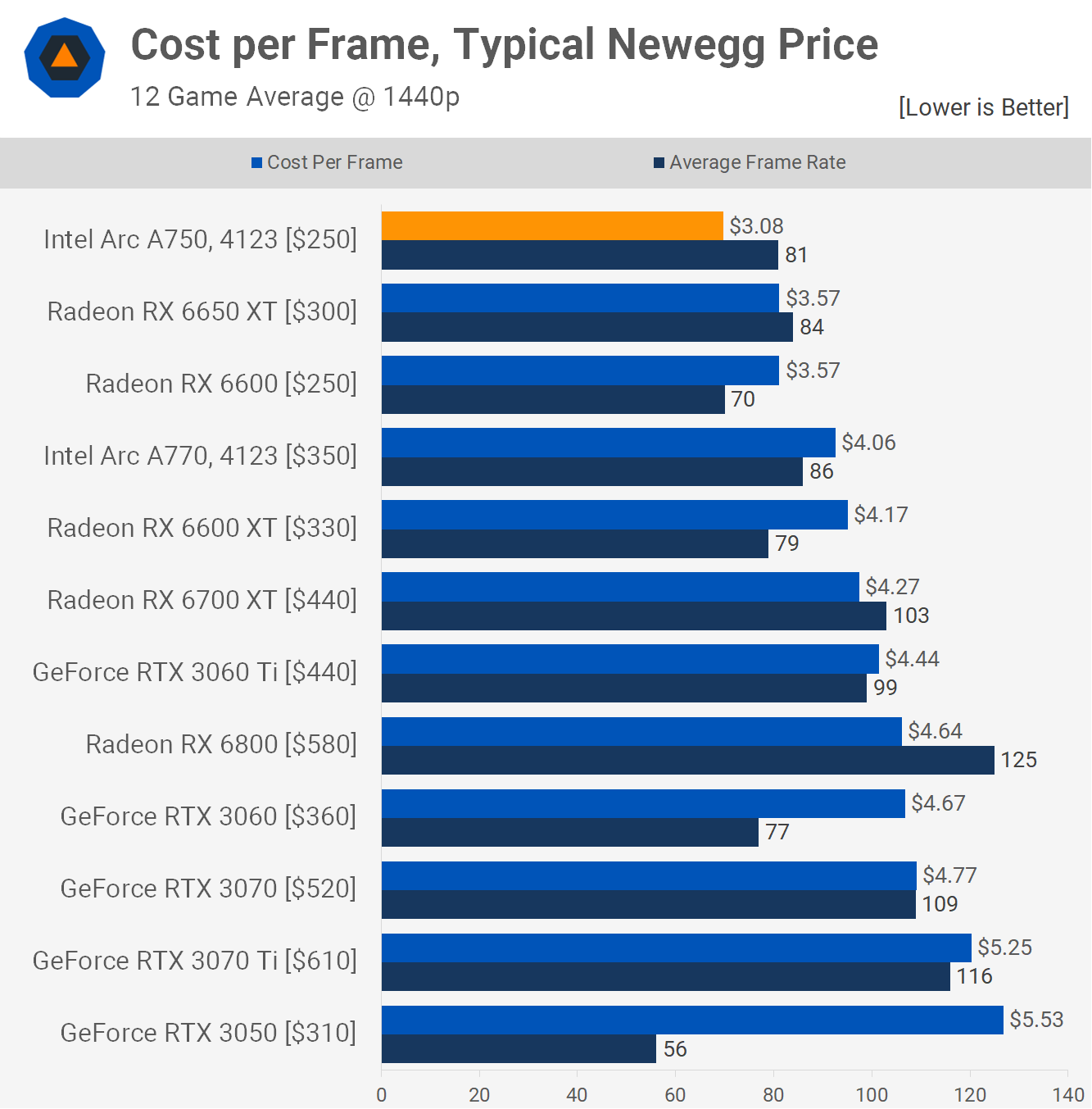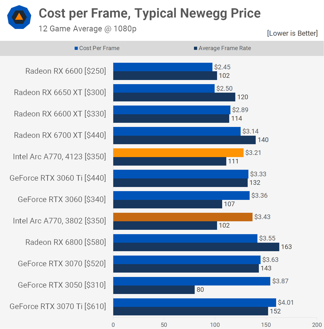 The 1440p results are far more competitive though, here the A770 was just 14% more costly per frame than the 6650 XT. While the $50 discount the Radeon GPU has over the A770 is still quite substantial, Intel's now in the same ballpark and certainly offering far more value than Nvidia.