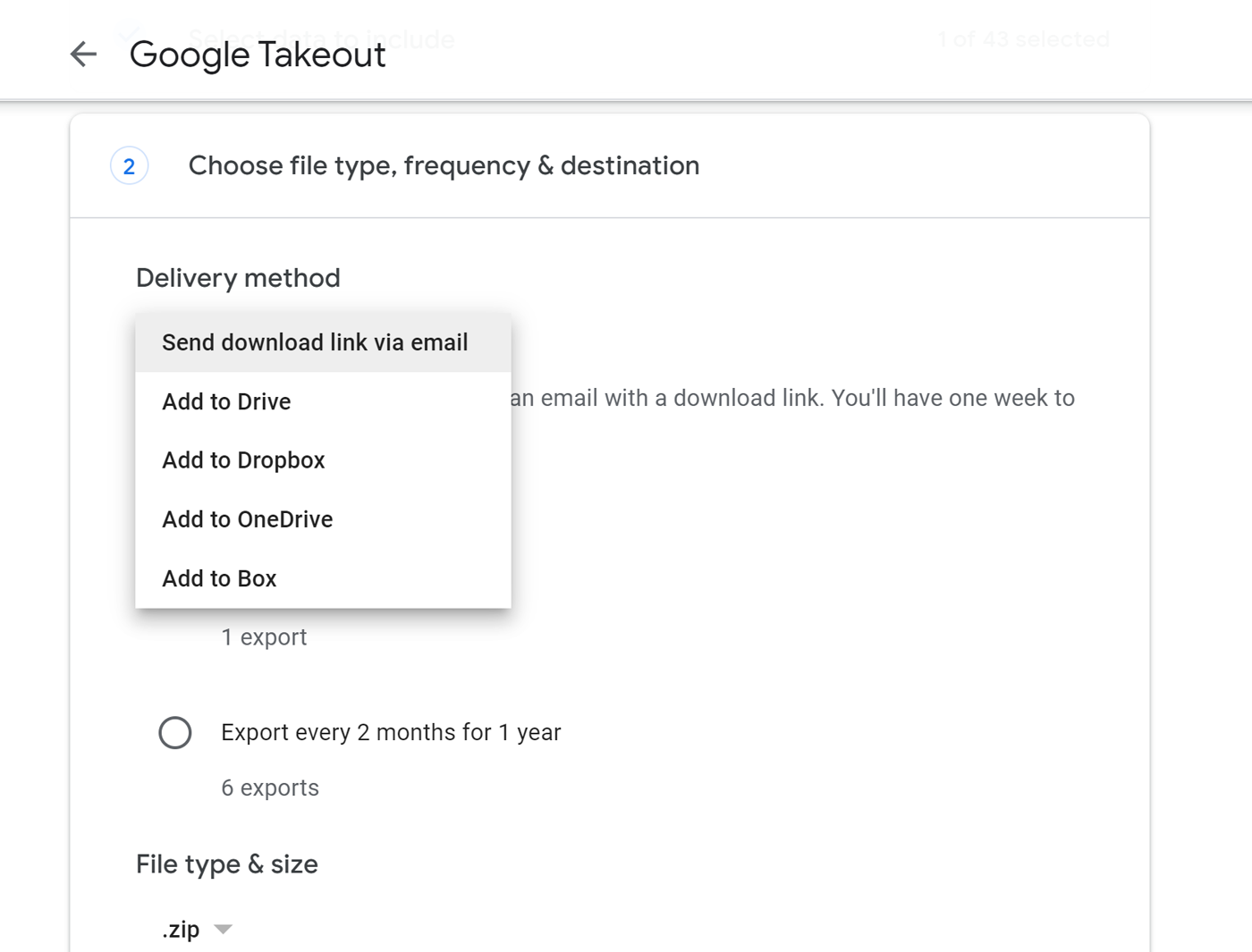 For Dropbox, OneDrive, and Box, you will need to link the respective account to your Google account. This is done before the export begins.