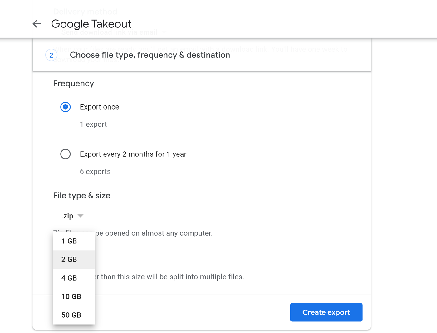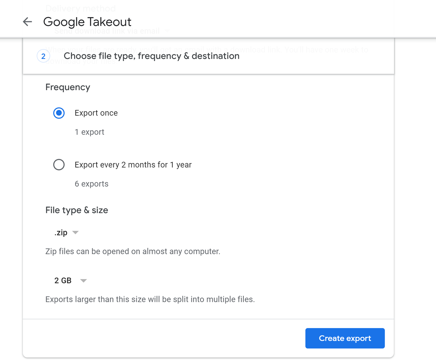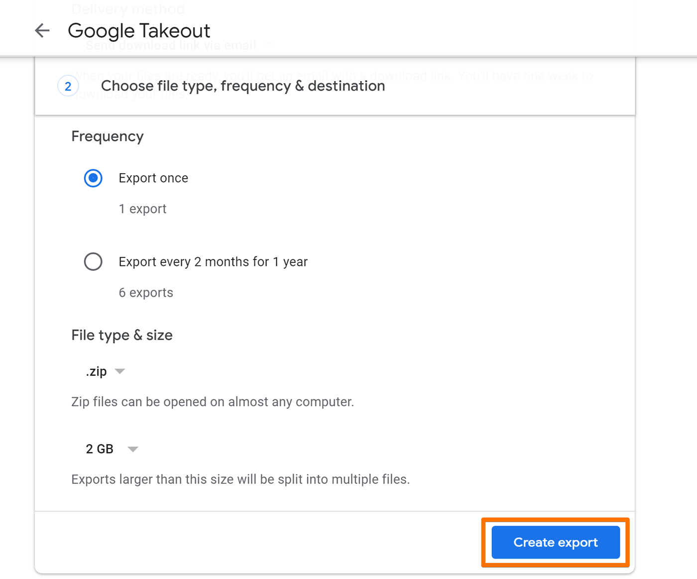 14. Click "Create export" or "Link accounts" and create export to initiate the process if Dropbox, OneDrive, or Box were selected above.