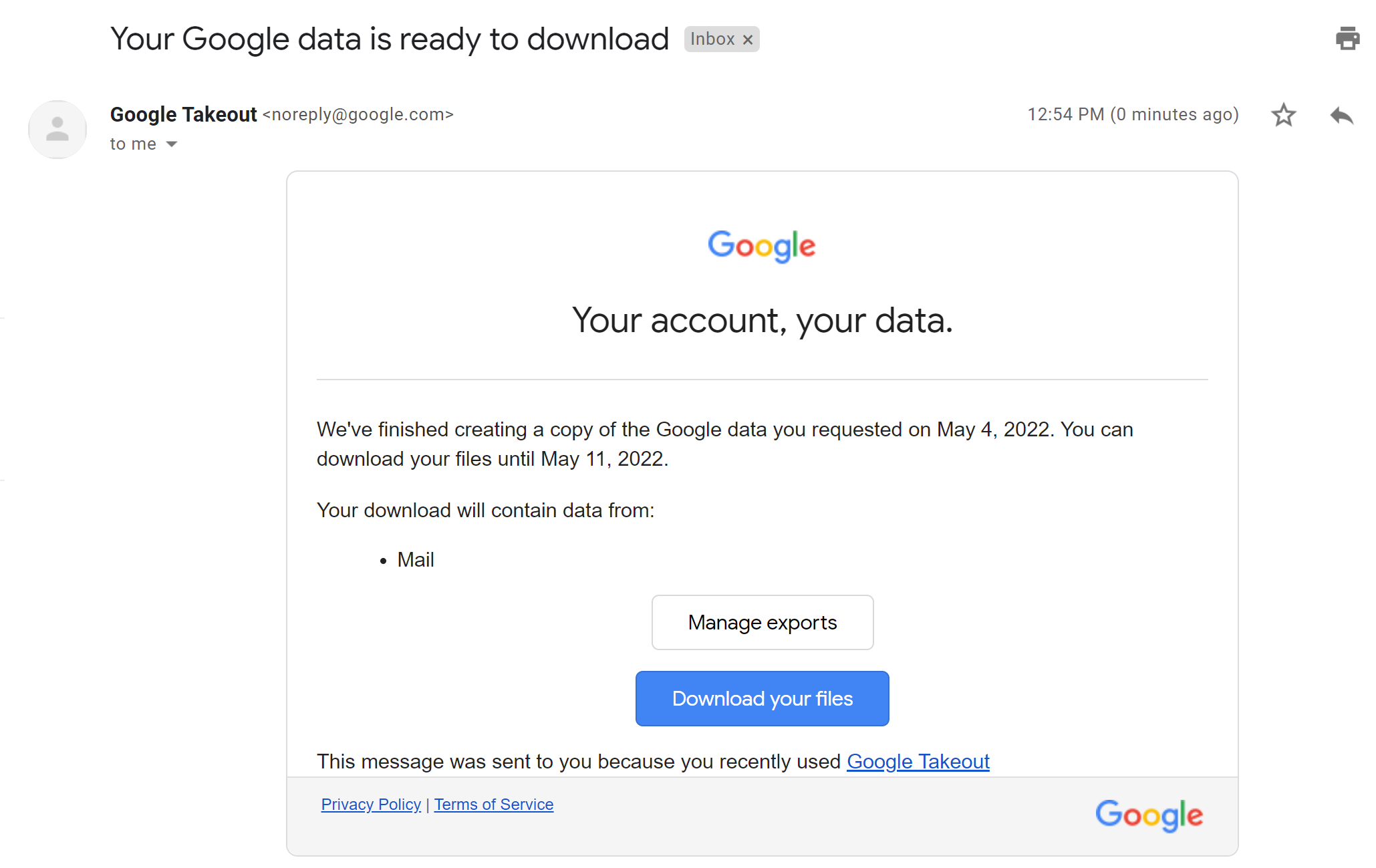 15. After the process has completed, an email will be sent to your Gmail account to download and manage the export.