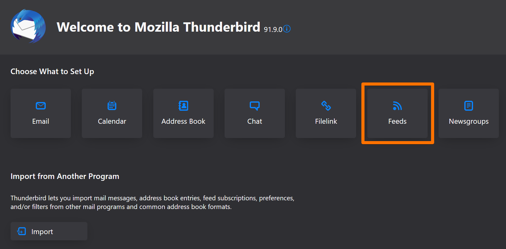 1. Open Thunderbird and tap Feeds to create an empty Feed Account.