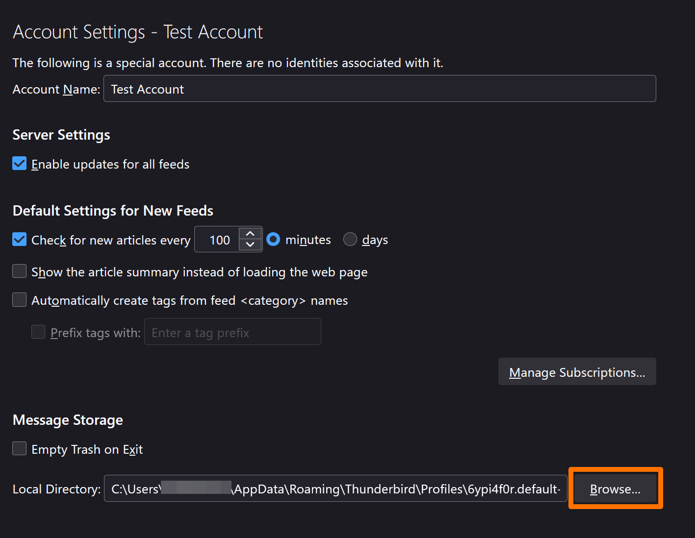 3. Under the Message Storage section, click on Browse and open the folder containing the MBOX file(s).
