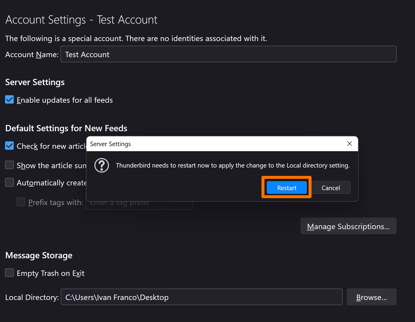 4. Click Restart when prompted to restart Thunderbird and access the emails offline