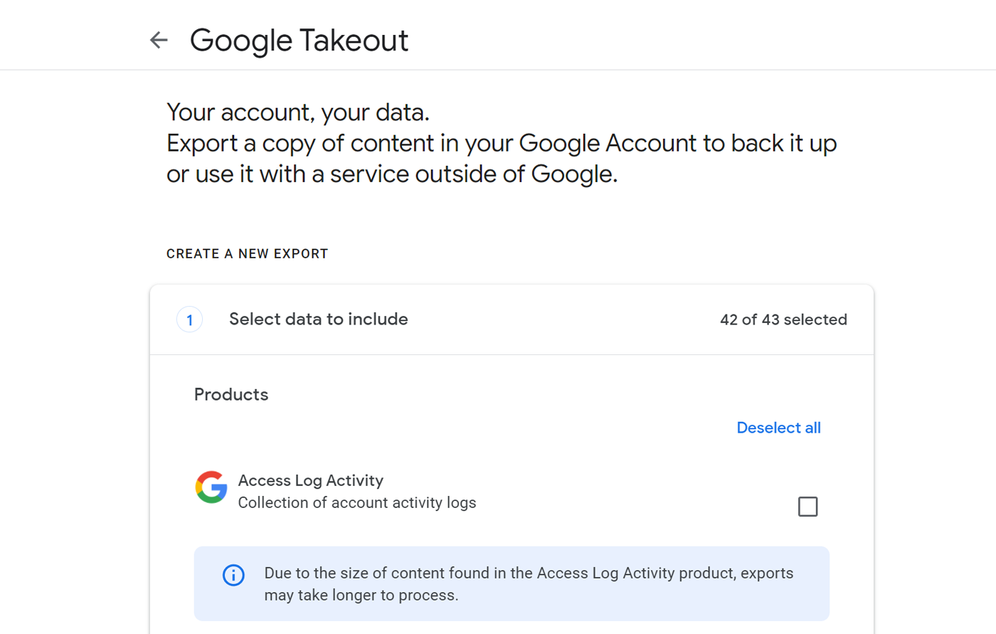 6. The Google Takeout page opens to display all Google products linked to your account.