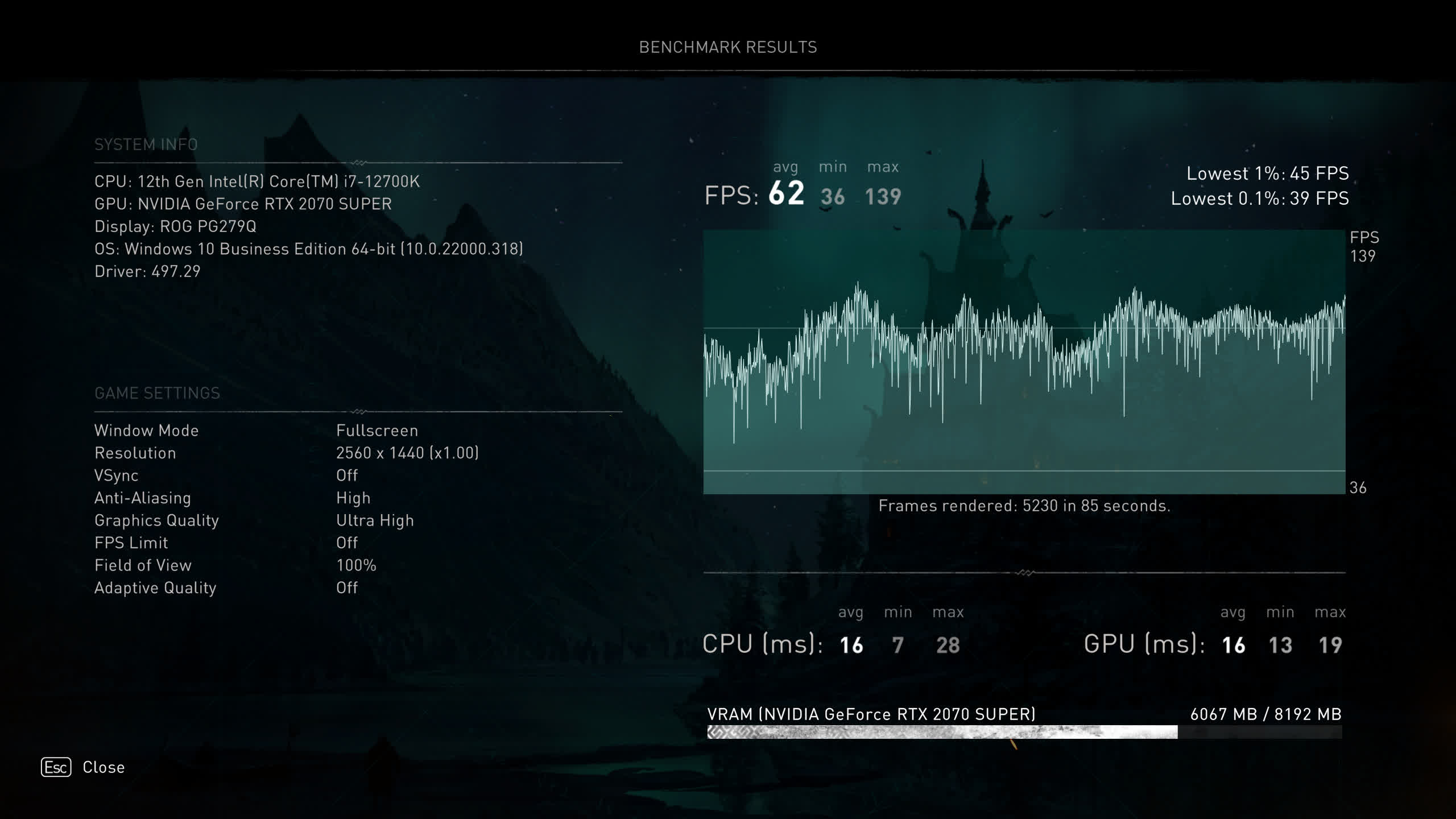 Next up is Assassin's Creed. Bizarrely, Intel still lists this as one of the games affected by DRM issues when running on Alder Lake machines, yet it works fine. I decide to see how far I can push it by selecting the Ultra High option, not expecting it to be playable on something lower than an RTX 3070. The result? An astounding 62 fps, an improvement of around 20 fps. A game that was already beautiful looks incredible and runs as smooth as butter. Where will I find the time to play all these titles?